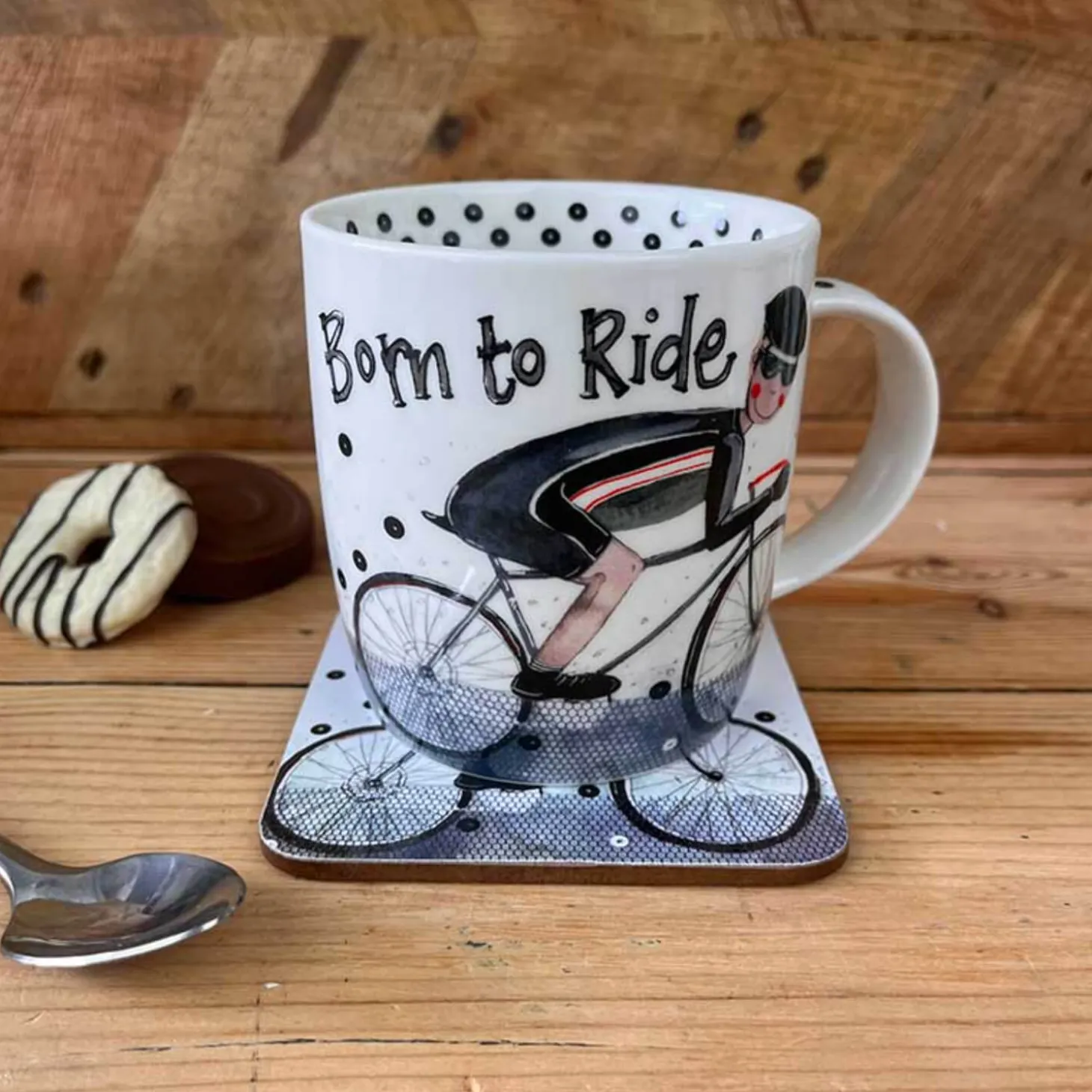 Alex Clark presents the ‘Born To Ride’ mug, this fabulous mug features an illustration showing a rosy-cheeked cycling enthusiast wearing their racing gear. Further illustrations feature around the inner rim and down the handle. A lovely way to start your day with a tea or coffee in this great mug!