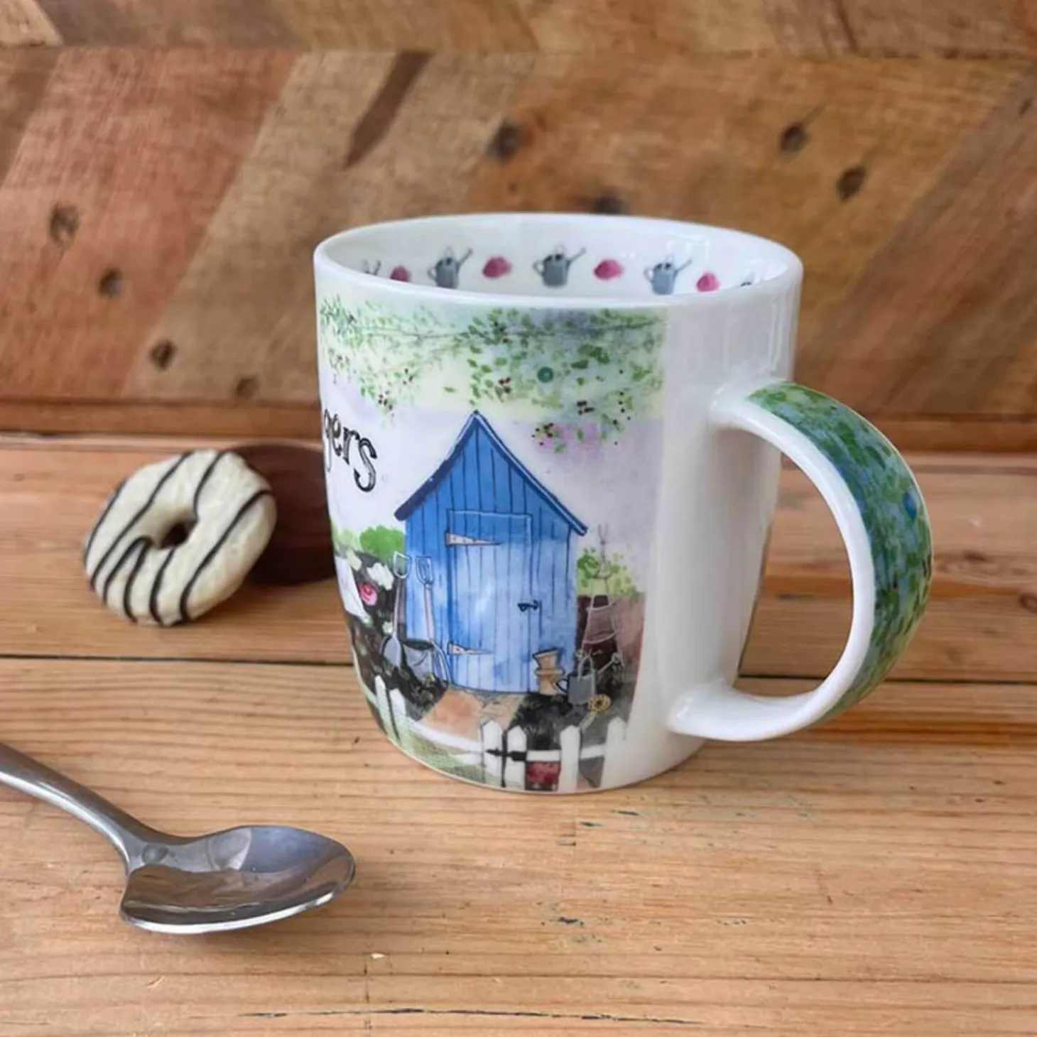 Alex Clark presents the ‘Garden Shed’ mug, this fabulous mug features an illustration showing a blue shed in a pretty garden with a bird holding an envelope. Further illustrations feature around the inner rim and down the handle. A lovely way to start your day with a tea or coffee in this great mug!