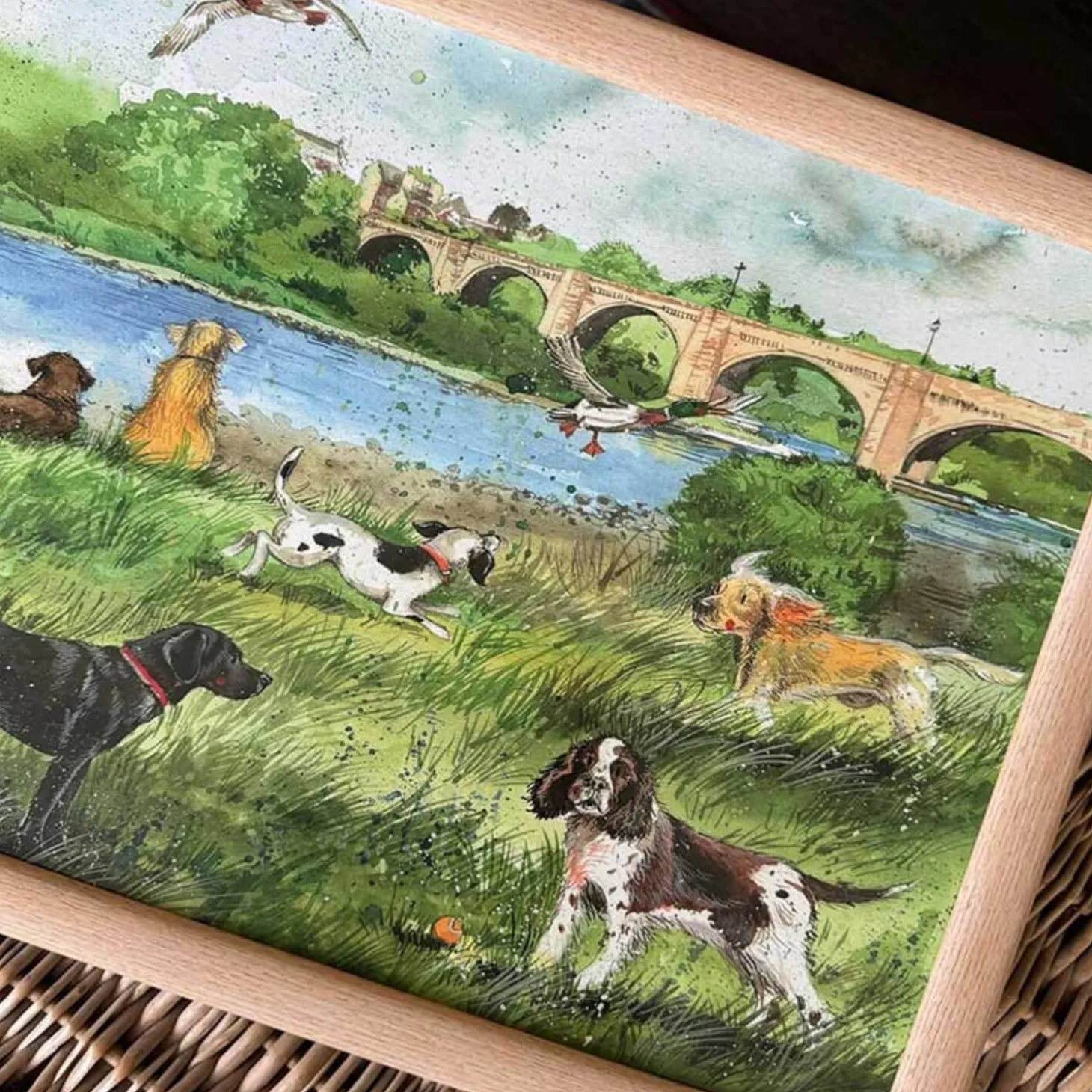 Alex Clark presents the River Walk Lap Tray, featuring a beautiful illustration of an array of delightful dogs having fun by the river, framed in a wood-effect trim. The underside features a soft blue fabric bean bag for added stability and comfort, making it perfect for enjoying dinners, snacks, or drinks on your lap.