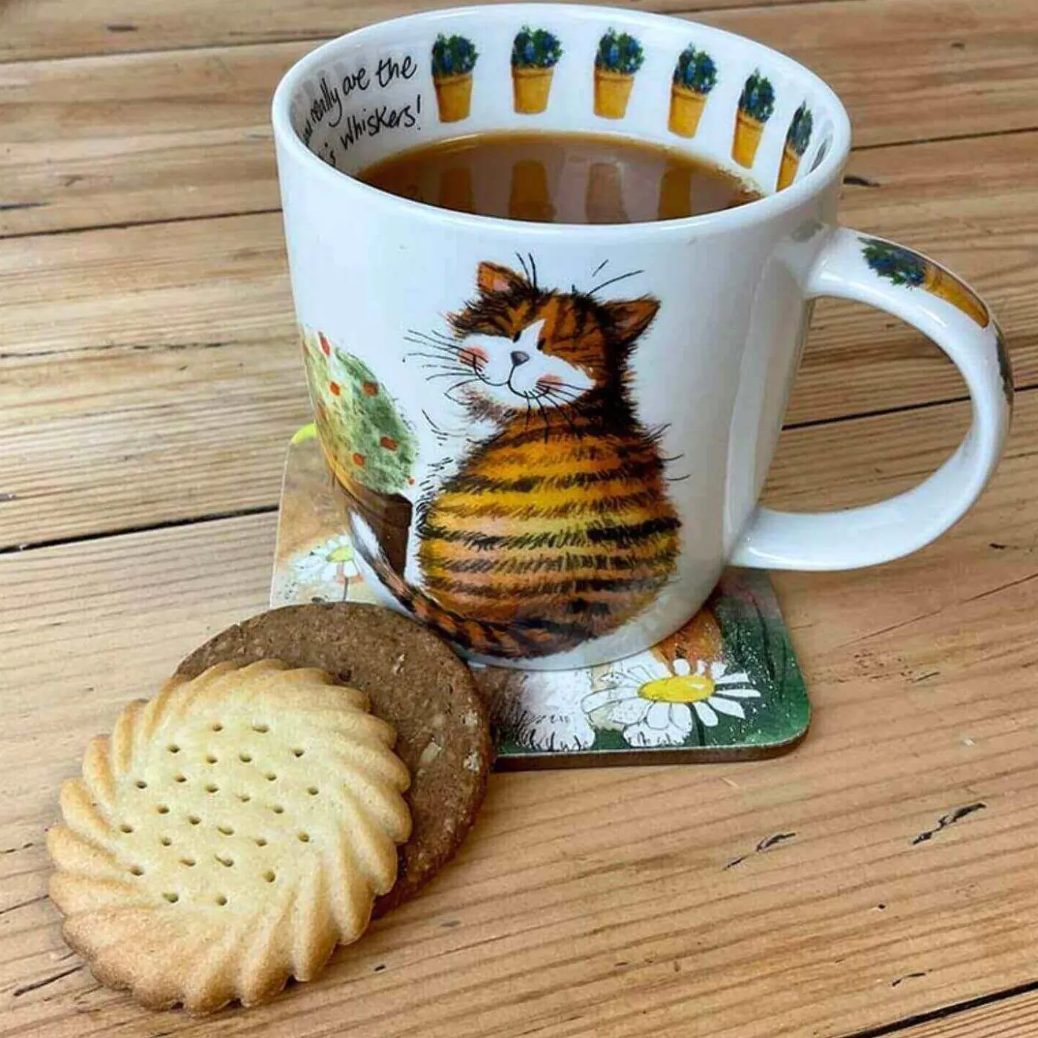 A lovely way to start your day with a tea or coffee in this lovely Alex Clark mug. This mug features a delightful illustration by Alex Clark of a big fluffy cat with lots of flower pots, there are decorations around the inner rim and also down the handle. Perfect for your favourite hot drink.