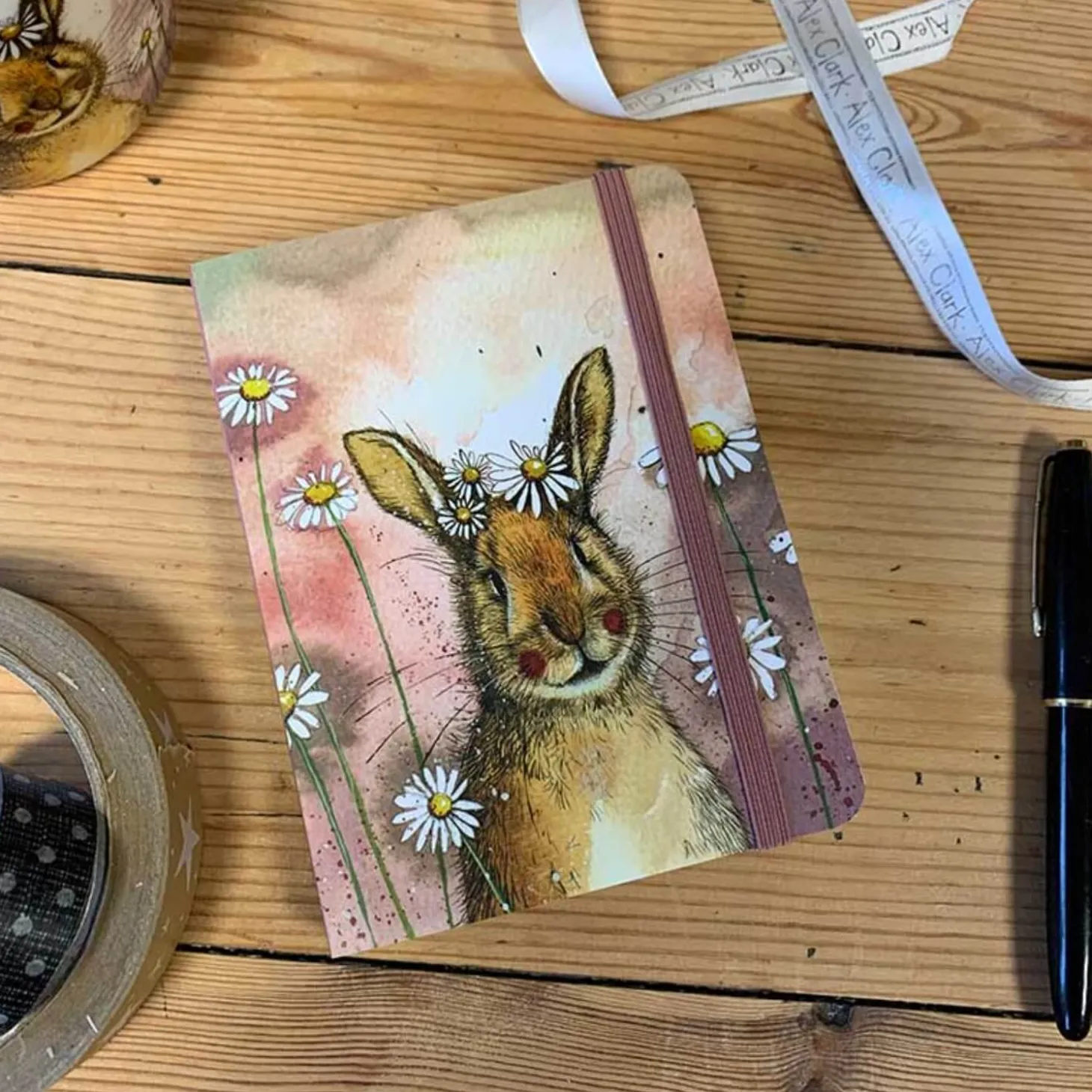 Alex Clark presents the ‘Rabbit & Daisies’ Small Chunky Notebook, featuring a beautiful illustration on the cover of a delightful rabbit with daisies. This soft-backed notebook has 160 lined pages and a space on the inside of the front cover for you to personalise. There is a wide colourful elasticated band to hold the notebook closed. A great notebook for work, college or school.