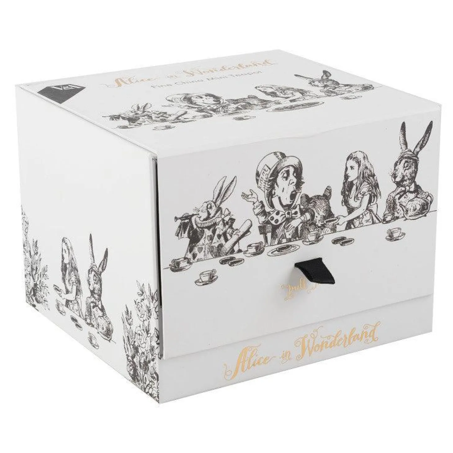 - Features gold accents and quotes ‘We’re All Mad Here’ around the lid