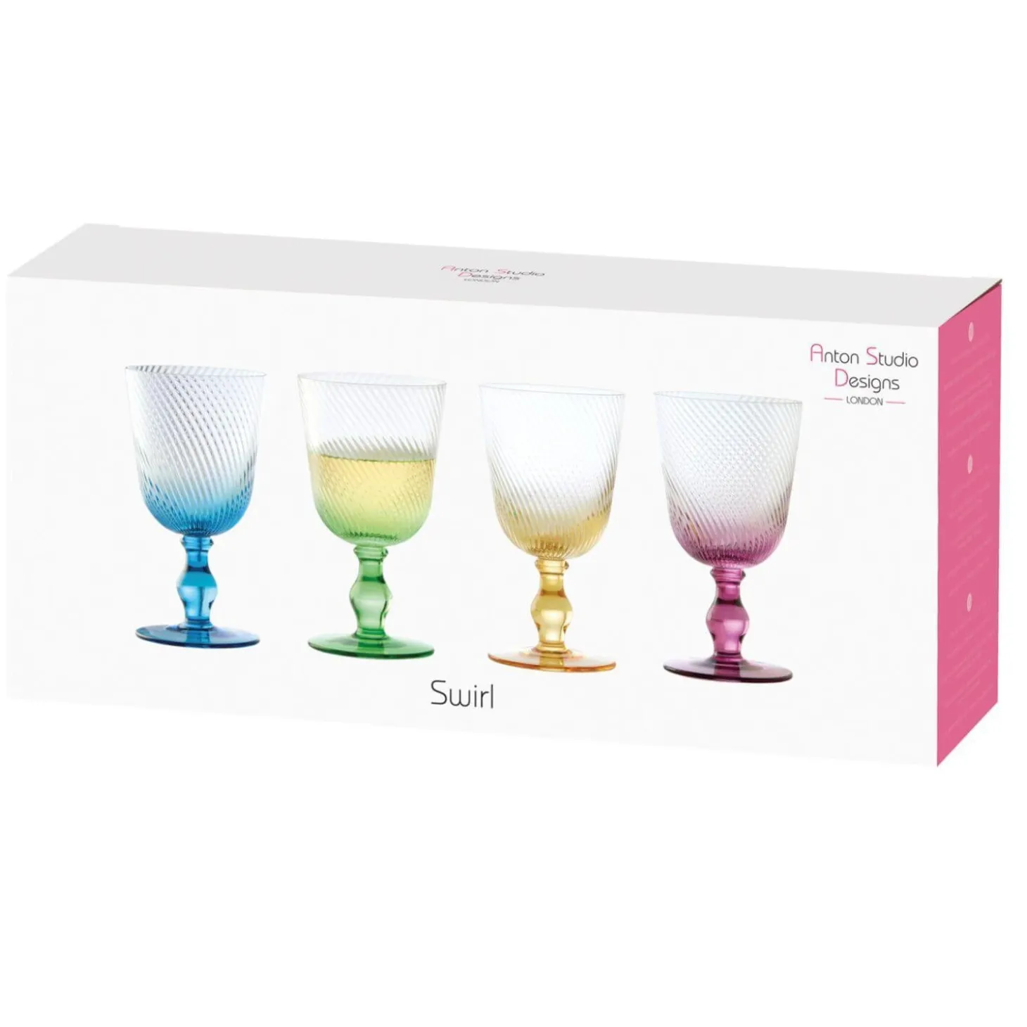 Designed in the UK by Anton Studios, these beautiful Swirl Wine Glasses come in a set of four different colours, blue, green, orange and pink. The colours fade up the glasses creating an ombre effect and are mouth-blown by skilled craftsmen making them unique as well as lovely to look at. Impress your guests by serving their drinks in these Anton Studios wine glasses.Â