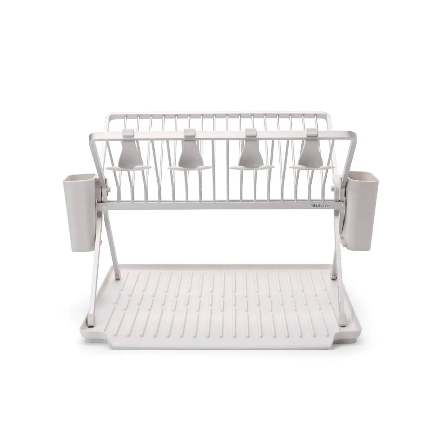 Brabantia presents their SinkSide Large Foldable Dish Rack in Light Grey, space-saving and compact when folded, this dish rack can hold up to 16 plates, it has two removable cutlery draining baskets and very clever hooks to enable you to hang up to 4 wine glasses to dry. This dish rack comes with a drip tray that you can use with the rack or separately, it is ribbed and sloped to allow water to drain away directly into your sink. Made from durable corrosion-resistant materials this rack is comprised of 29% recycled material of which 96% is recyclable after use.