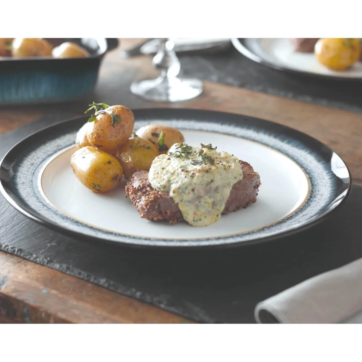 Each item in the twelve-piece dinnerware set from Denby has been crafted from high-quality stoneware and has a rich Halo speckled finish giving it a unique aesthetic. This set comprises four dinner plates, four small plates and four cereal bowls perfect for everyday use and special occasions.