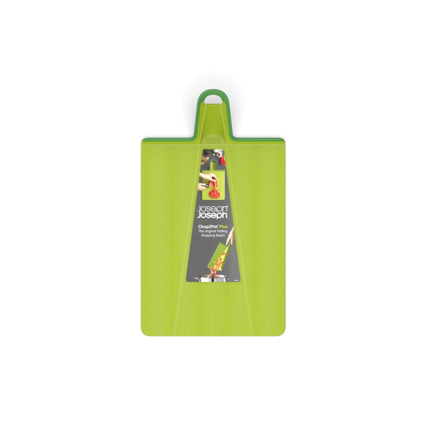 Joseph Joseph presents the Chop2Pot Plus Large Chopping Board in Green, this clever board allows you to easily prepare meat, fruit and vegetables and scoop them directly into your pots and pans, simply squeeze the soft-grip handle on the cutting board which will then create a chute for you to dispense your chopped produce easily. A great cutting board for all cooks kitchens.