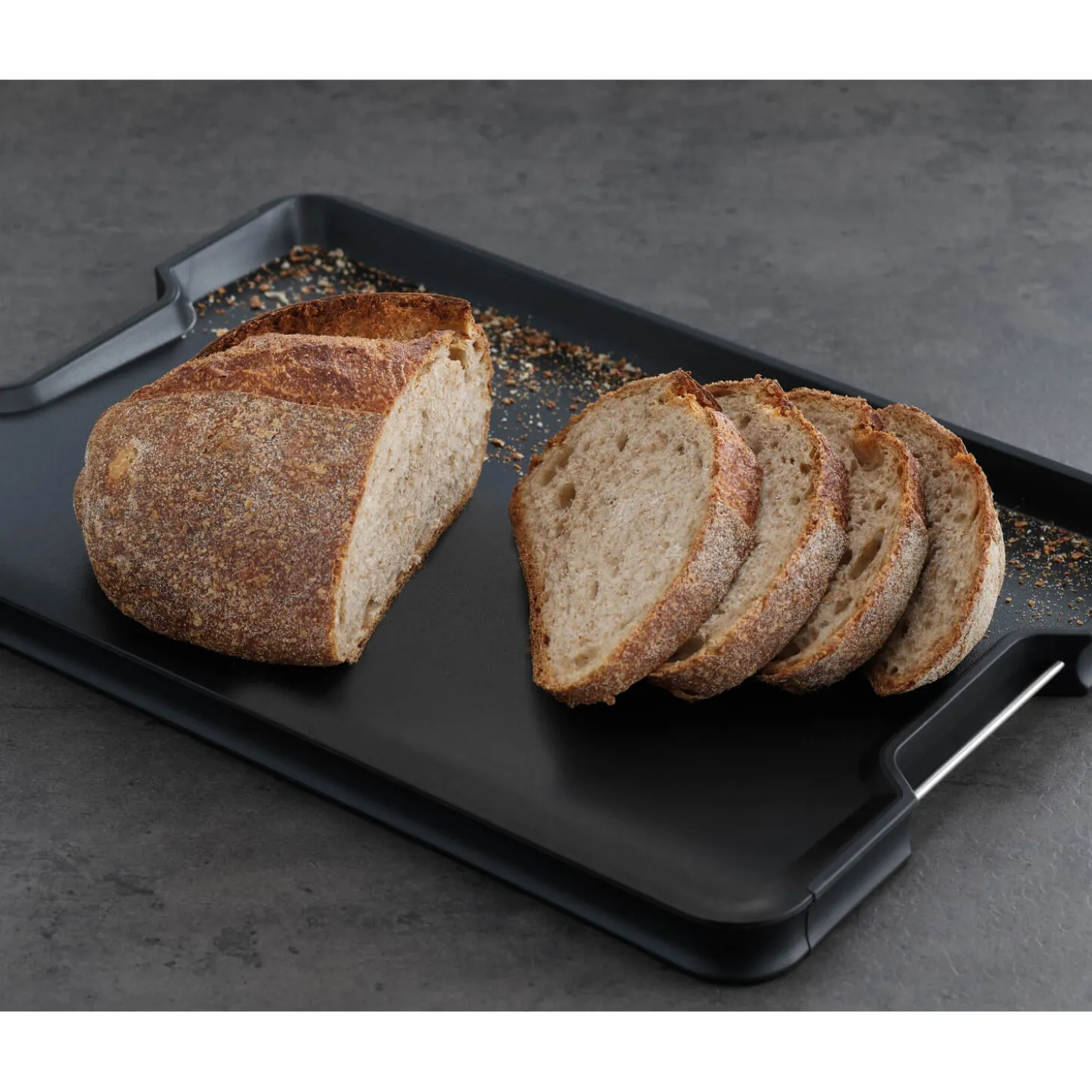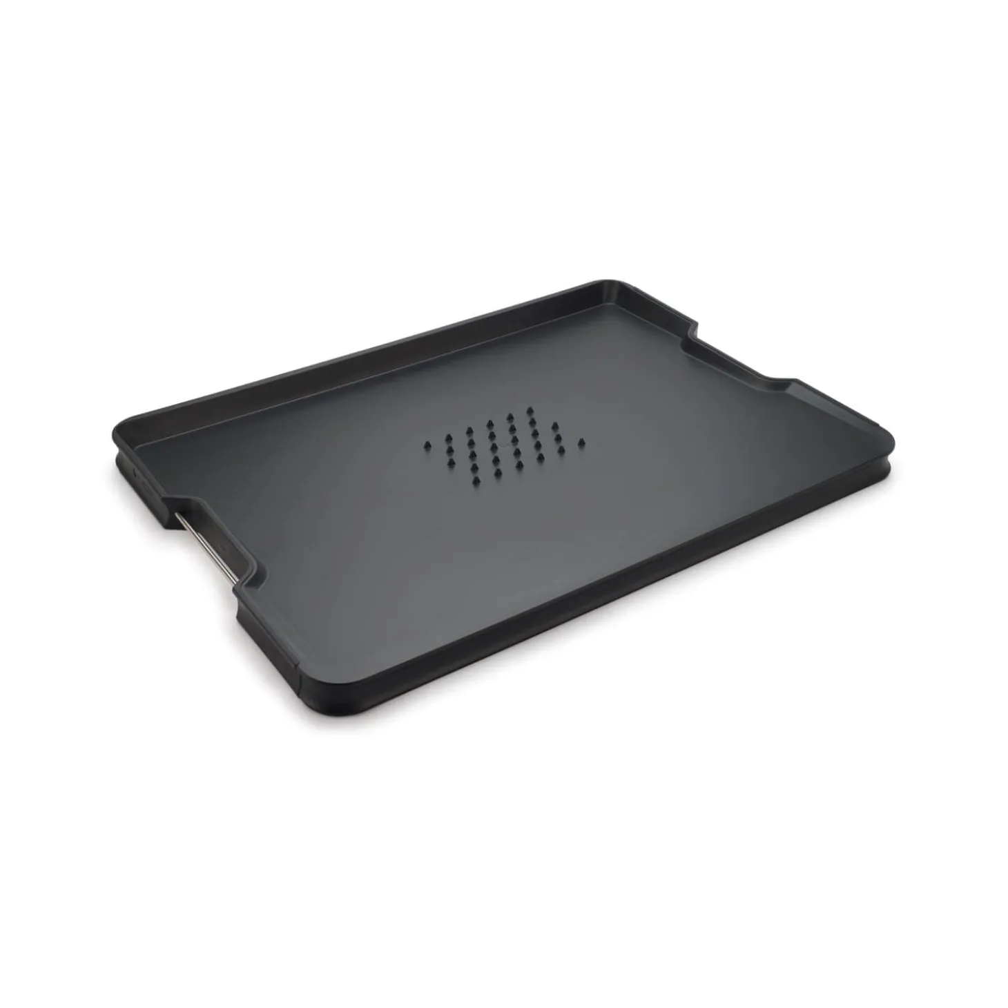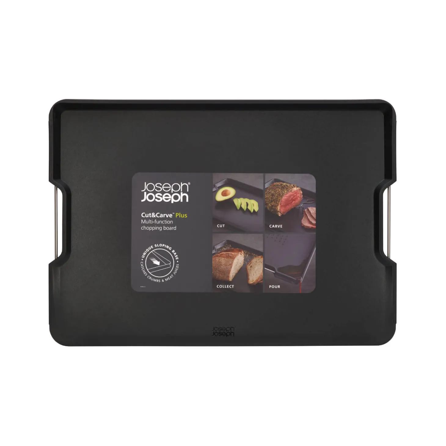 Joseph Joseph presents the Cut&Carve Plus Extra Large Chopping Board in Black, the perfect carving board for your Sunday Roast! Cleverly designed with a sloping angled base and raised edges, this board has easy-pour corners to collect meat juices for your gravy or crumbs if you are slicing a delicious loaf. One side of the board has a meat grip and the other side is smooth for cutting other types of food produce. This cutting board has stainless steel carry handles for easy transportation around your kitchen, a great addition to all cooks kitchens.