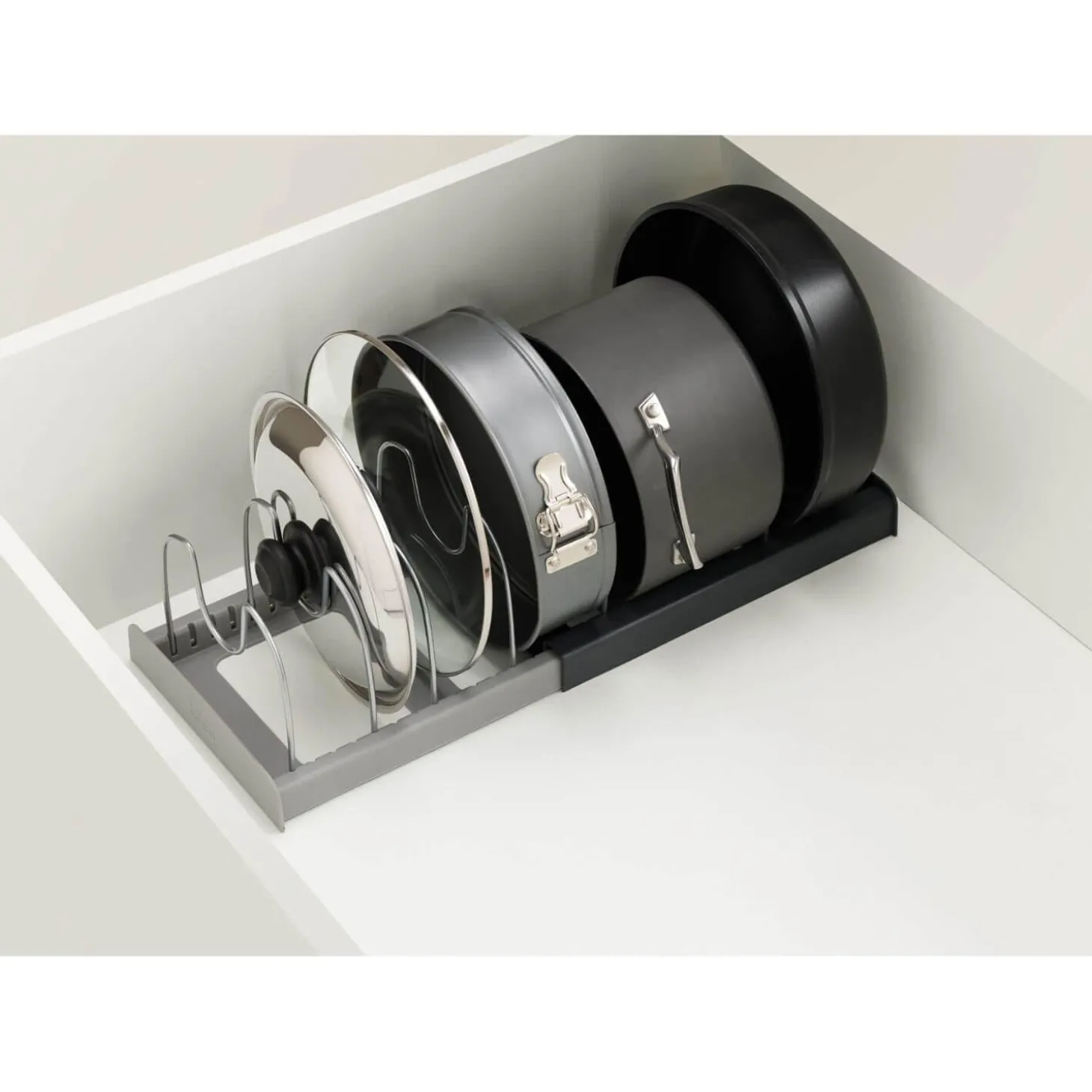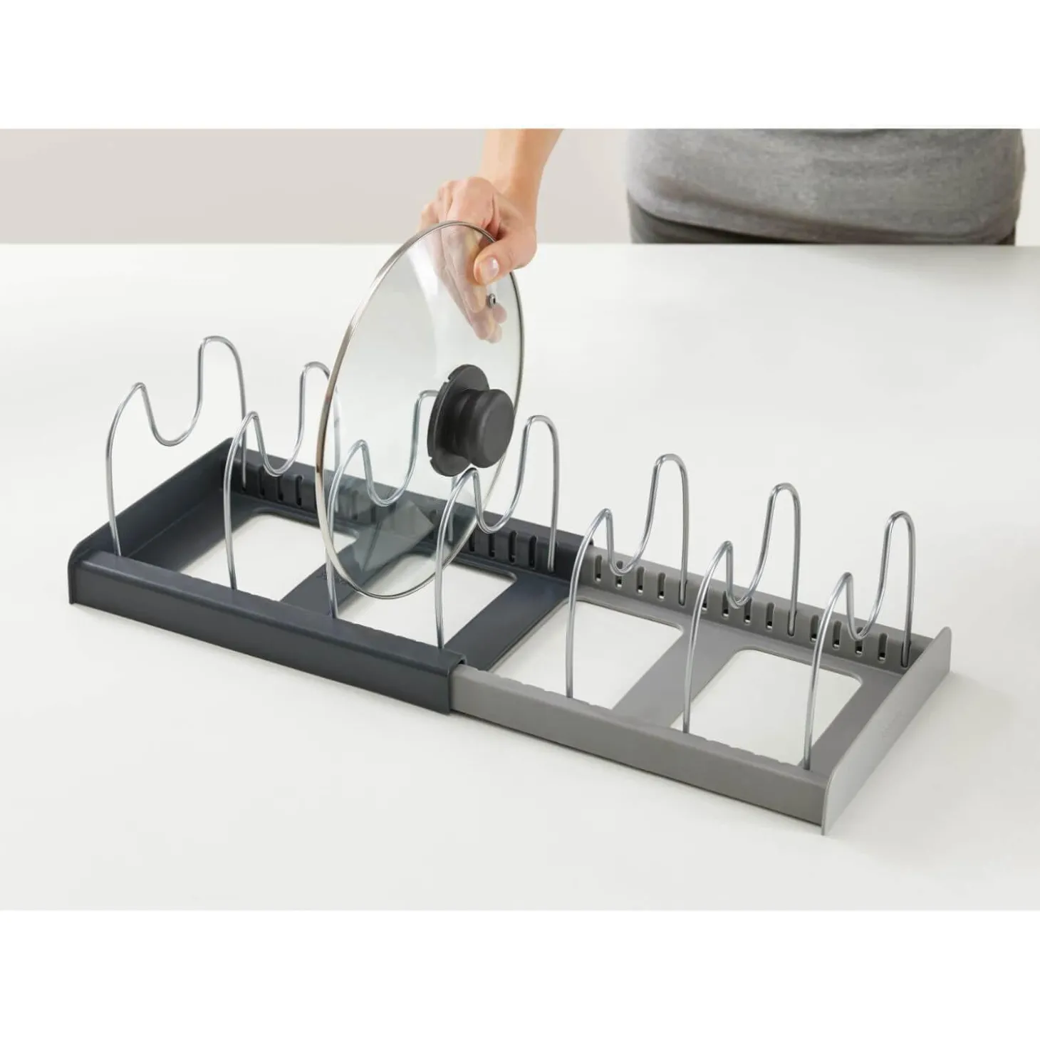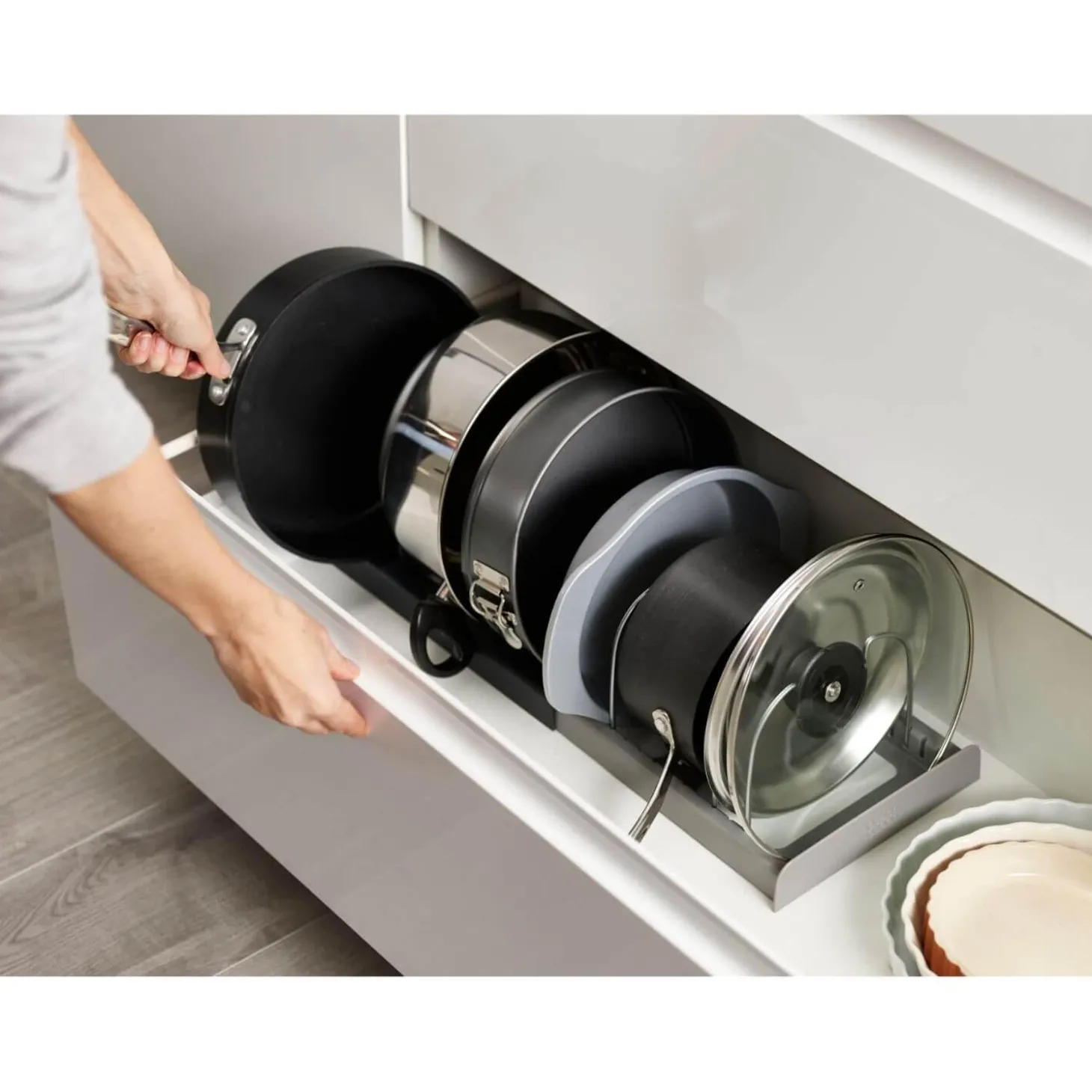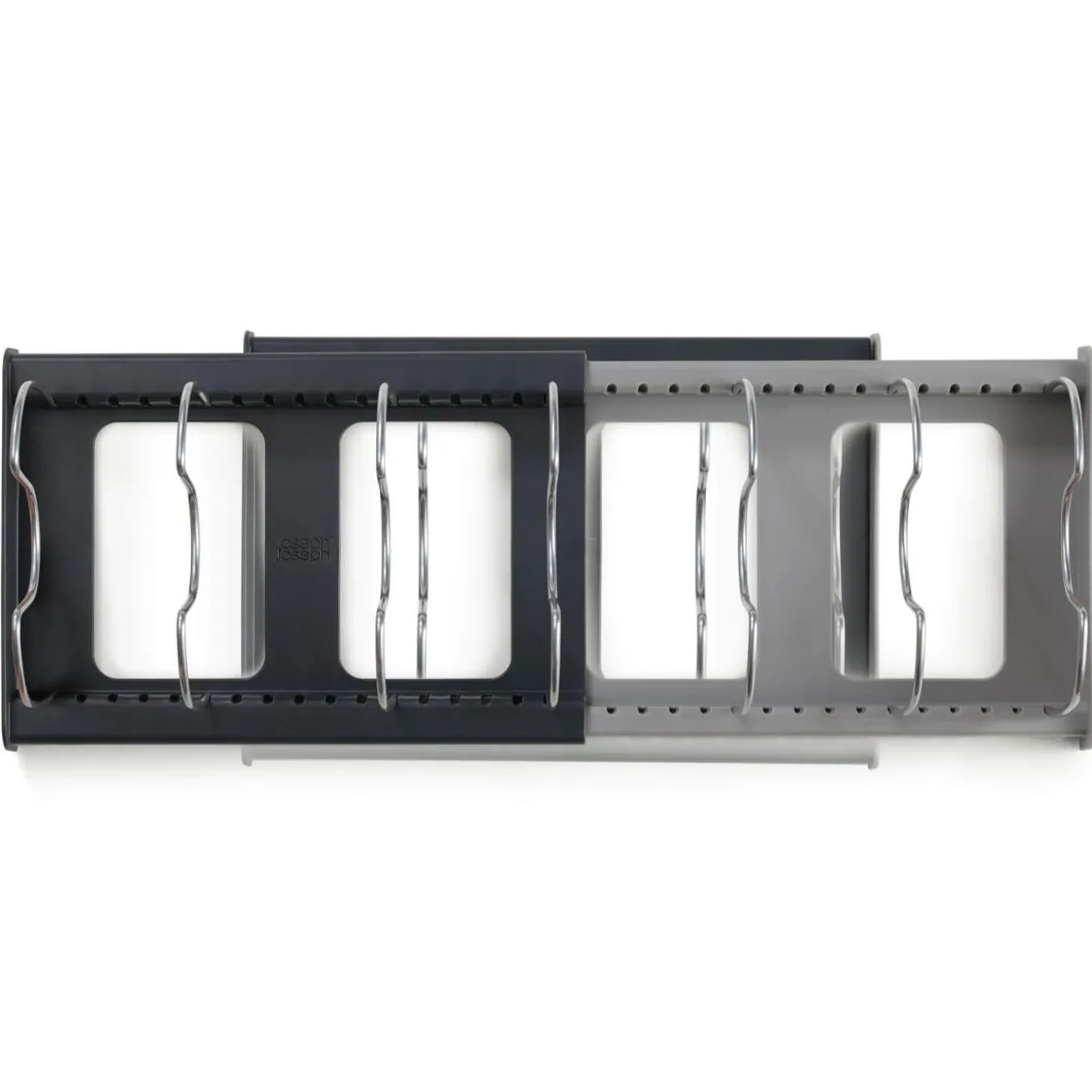 Joseph Joseph presents as part of their DrawerStore range, the Expanding Cookware Organiser in Grey. This product is ideal for keeping all your pan drawers organised. The organiser has seven adjustable wire dividers to accommodate all different sizes of lids, baking tins and pans, the wire dividers have slots for the pan lid handles. This organiser is brilliant for all cooks with busy kitchens.