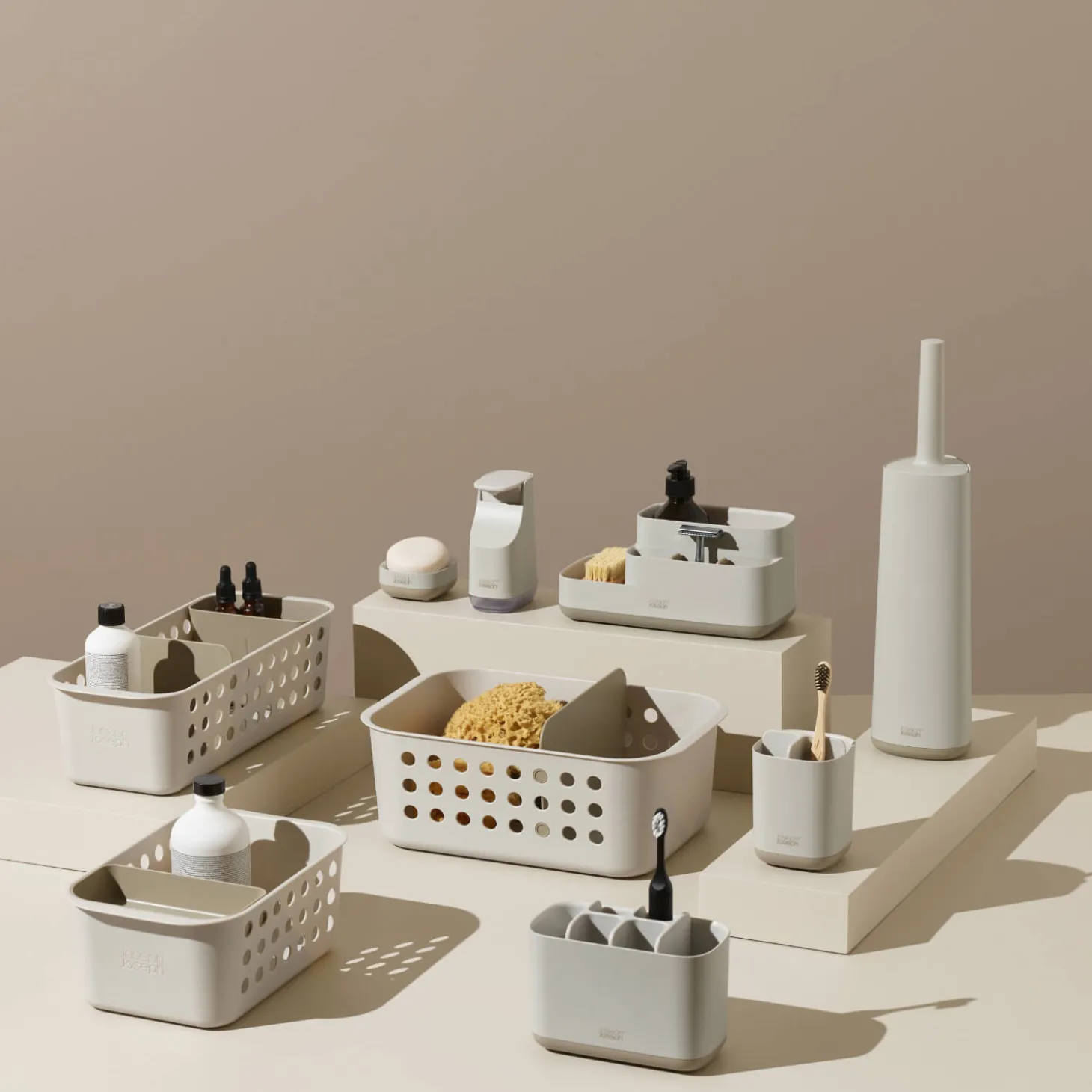 Joseph Joseph presents the EasyStore Large Bathroom Storage Basket in Ecru, perfect for storing all your bathroom products, either on shelves or in drawers. The sides are deep and ventilated to provide good air circulation around your products. There is a moveable divider allowing you to adjust the storage space to suit the size of your bathroom essentials.Â
