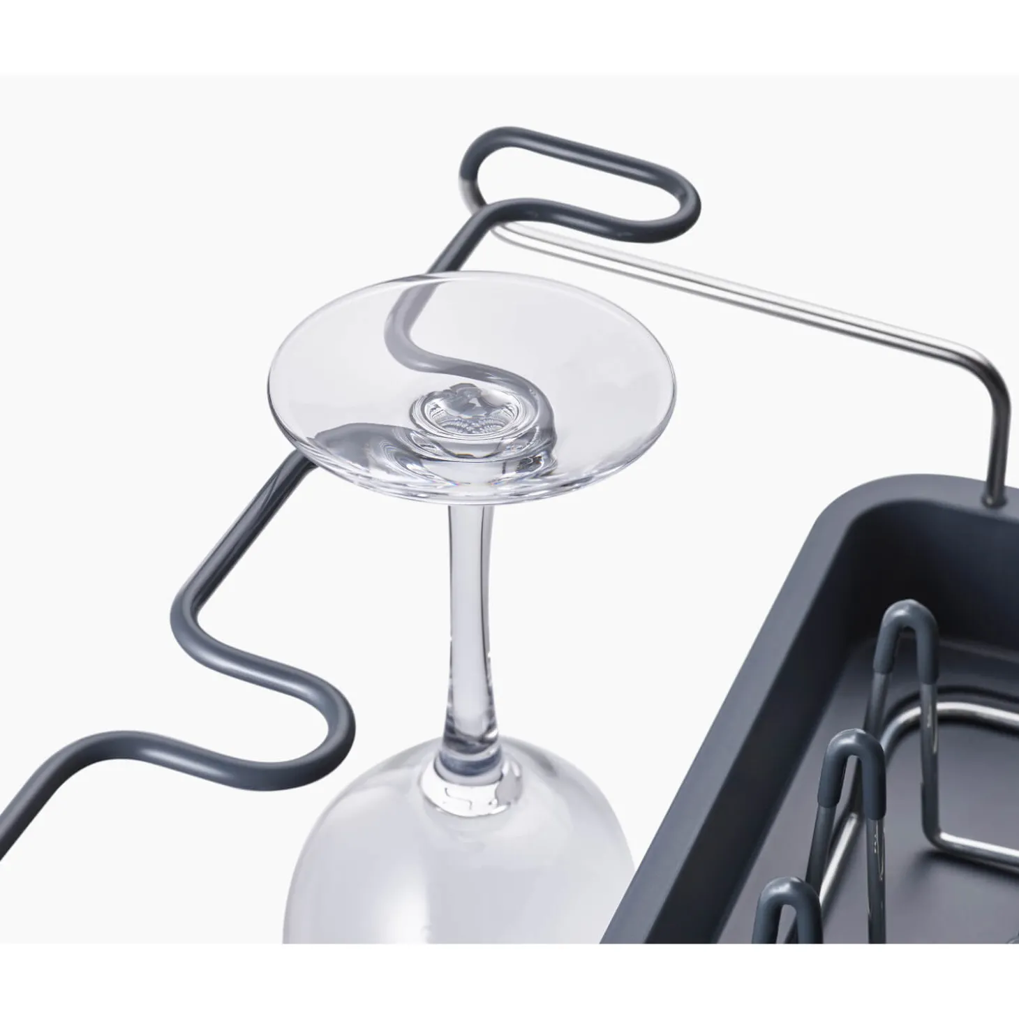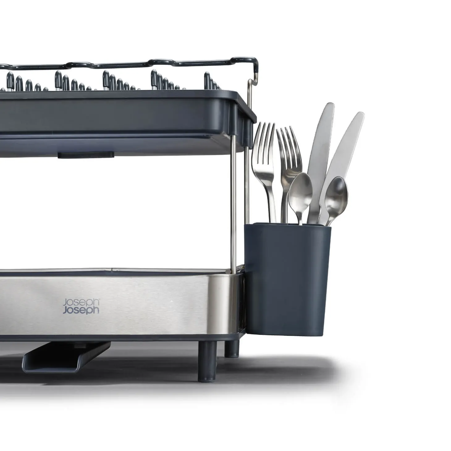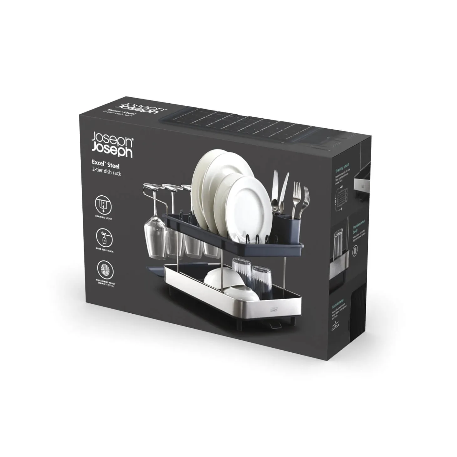 Joseph Joseph presents the Excel 2-Tier Steel Dish Rack in Grey and Stainless Steel, this great rack offers plenty of draining space but feeling compact at the same time and not crowding your sink area, it has an integrated drip tray underneath the built-in wine glass holder, enabling them to dry safely. The large capacity gives you plenty of room for all your crockery and dishes, the fast-draining design with its raised ribs prevents water from collecting underneath mugs or bowls. A great dish rack for all kitchens.Â