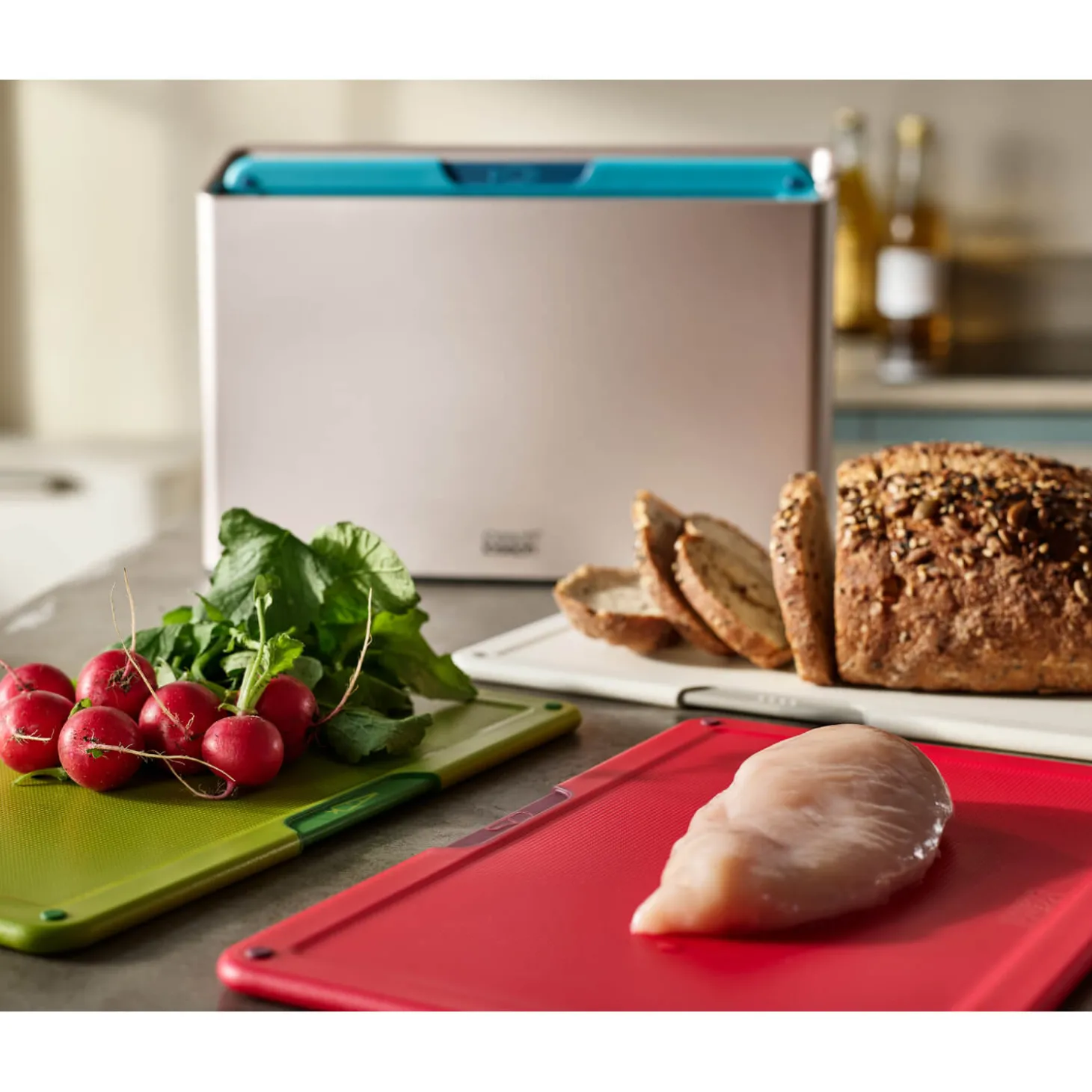 Joseph Joseph presents their Folio Icon Large Chopping Board Set, featuring four double-sided colour-coded chopping boards, an ideal worktop addition to prevent cross-contamination when preparing different ingredients in the kitchen. With a slimline design for convenient storage and a tiered design for easy selection with each board having icons for usage. Each board is designed with safety and convenience in mind, such as a textured surface on each side that is knife-friendly and has non-slip feet which allow for secure use whilst chopping and mincing ingredients.Â