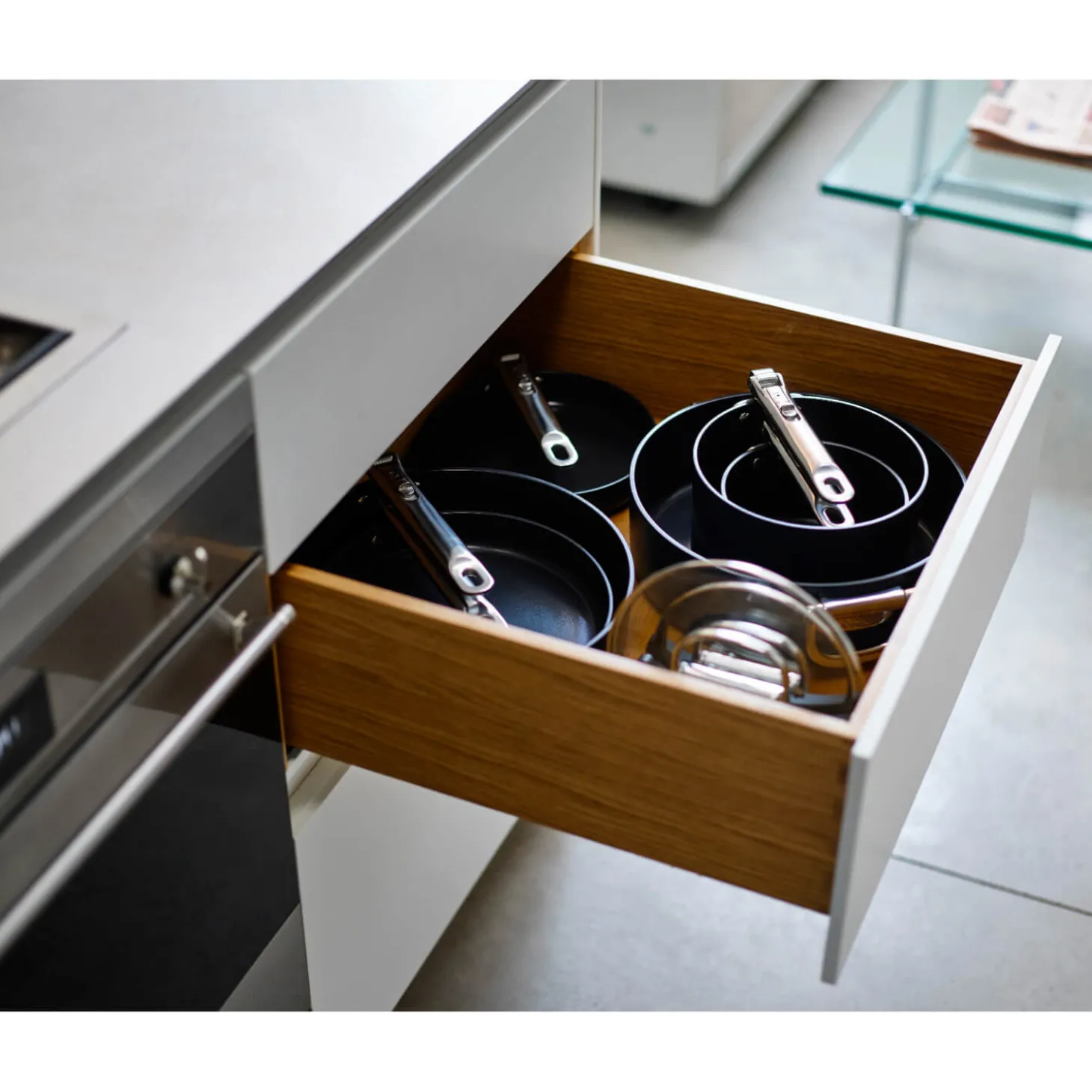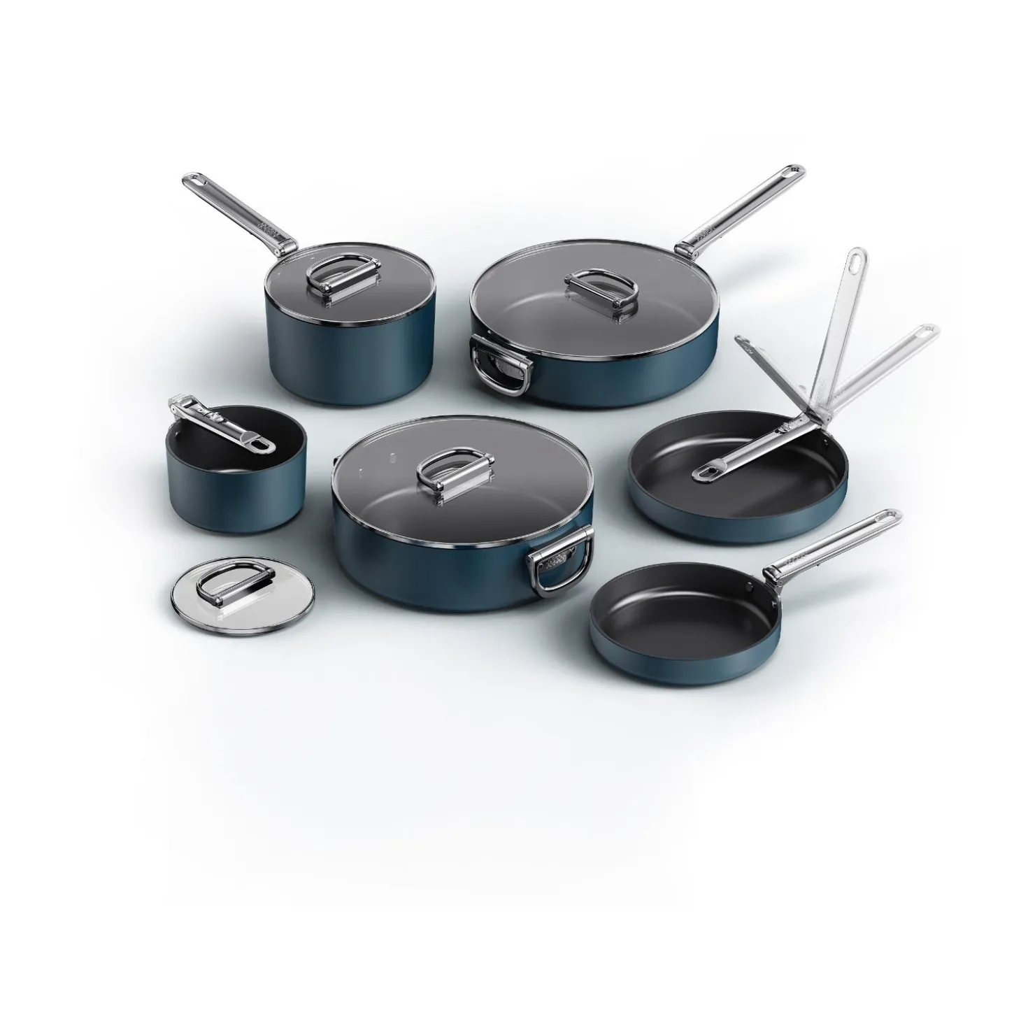 Joseph Joseph presents the 6-Piece Non-Stick Folding Handle Cookware Set in Midnight Blue from their innovative new range ‘Space’. This fantastic set is designed with space-saving in mind, with unique foldable handles which enable effortless organisation, and pan protectors for perfect, scratch-free, convenient storage. Built to withstand even the most demanding recipes when cooking in the kitchen, these pieces are hard-wearing with a thick construction and have a strong scratch-resistant coating for easy care. Moreover, the base of each pan heats and cooks evenly, providing exceptional results and a dependable cooking experience. The perfectly engineered cookware set, designed to meet the demands of even the busiest kitchens.