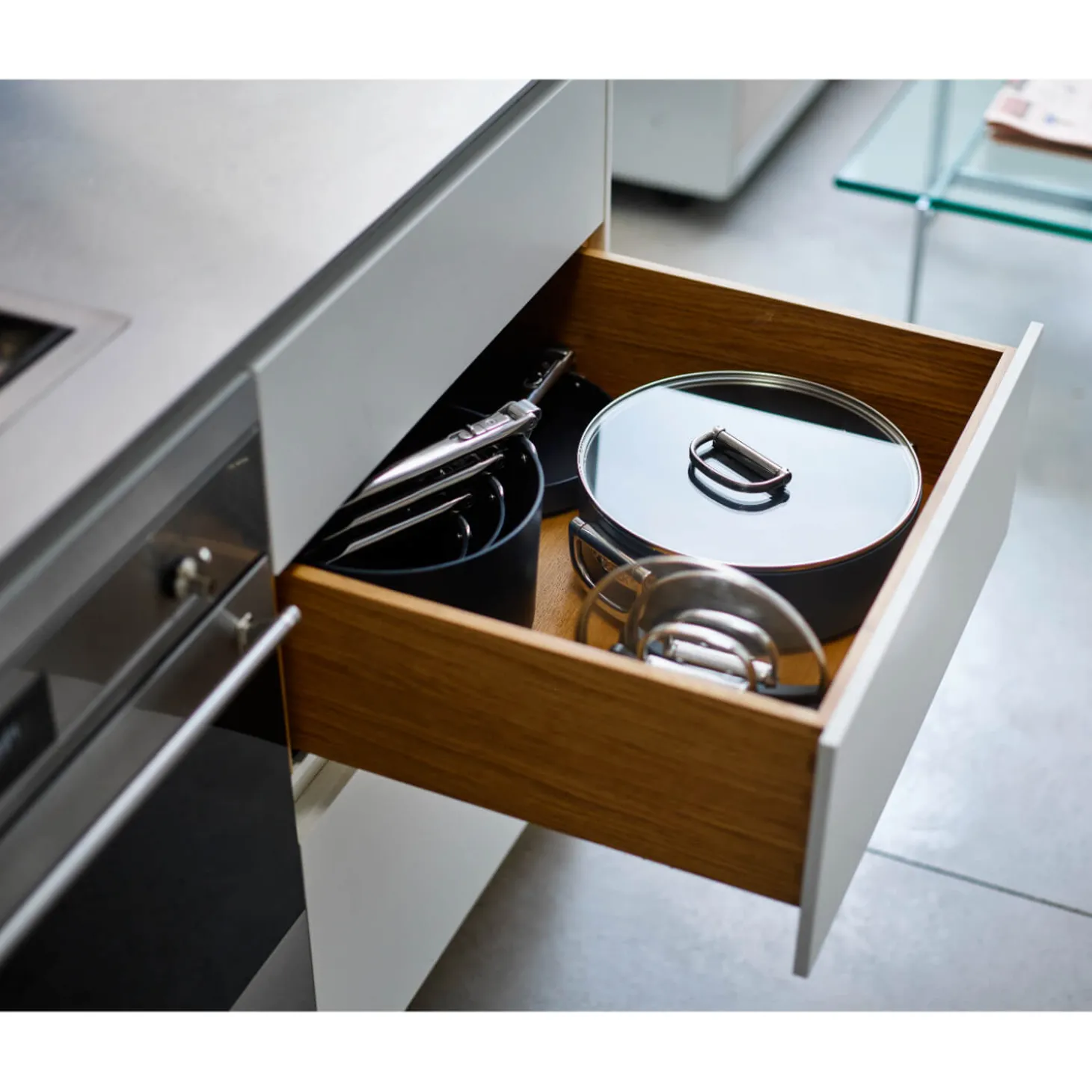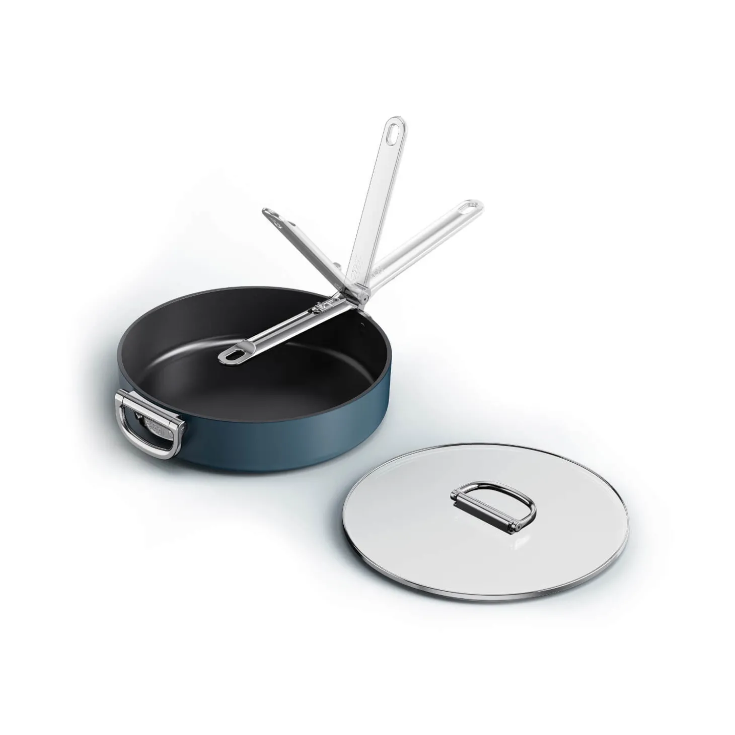 Joseph Joseph presents the 3-Piece Cookware Set in Midnight Blue from their innovative new Space range. These fantastic products are designed with space-saving in mind, with the foldable handles which enable effortless organisation, it is perfect for trouble-free, convenient storage. Built to withstand even the most demanding recipes when cooking in the kitchen, they are hard-wearing with a thick construction and have a strong scratch-resistant coating for easy care. Moreover, the bases heat and cook evenly, providing exceptional results and a dependable cooking experience. Perfectly engineered stock pots and pans that are designed to meet the demands of even the busiest kitchens.