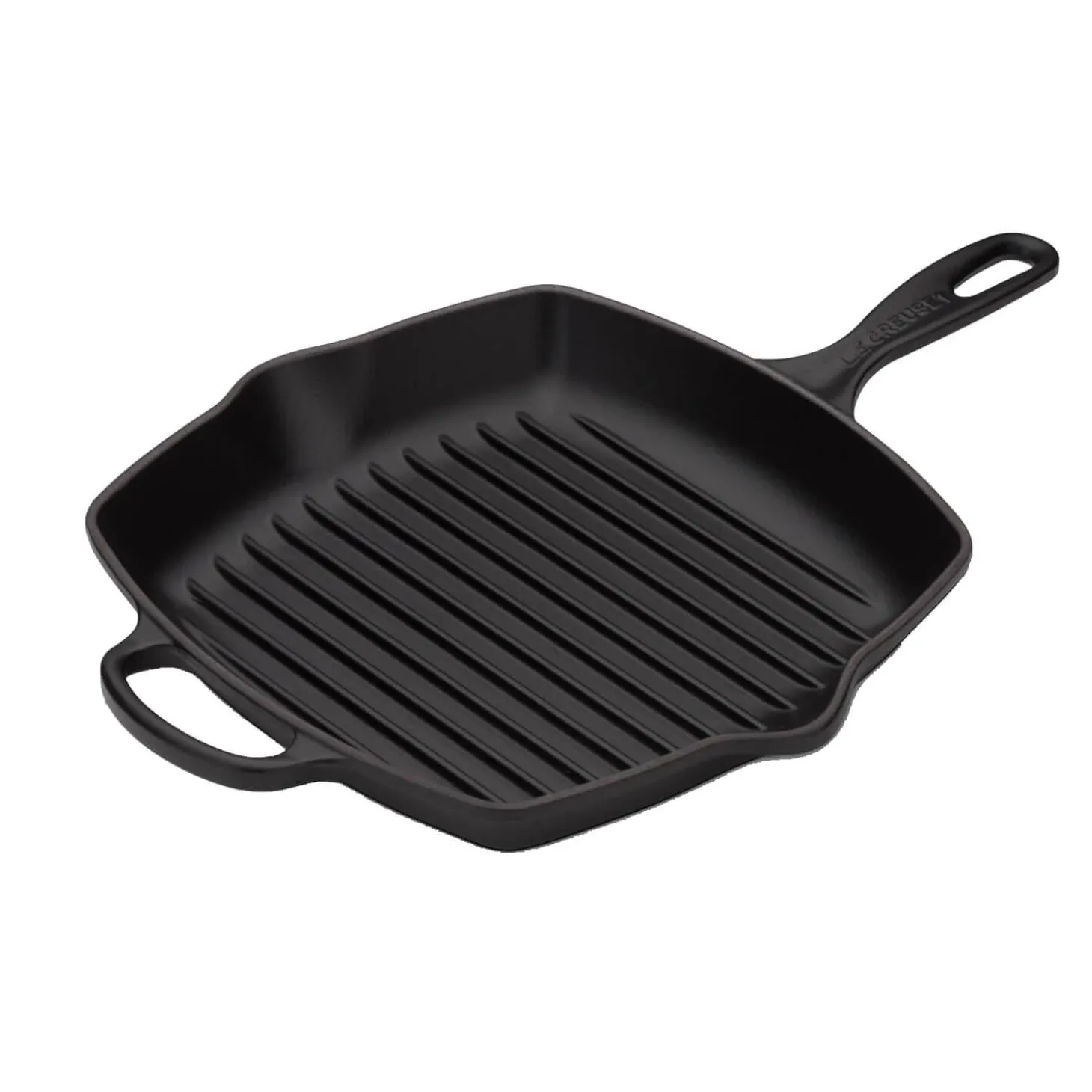 This Signature 26cm square cast iron grill pan in Satin Black from Le Creuset is ideal for grilling and searing a variety of ingredients such as chicken, steak, fish, vegetables and much more. The grill features a ridged cooking surface that allows excess fat and oil to drain away allowing for a healthier way of cooking and achieving those signature char lines. Created from cast iron the grill also has an enamelled coating which over time will achieve a natural patina and enhance flavour.