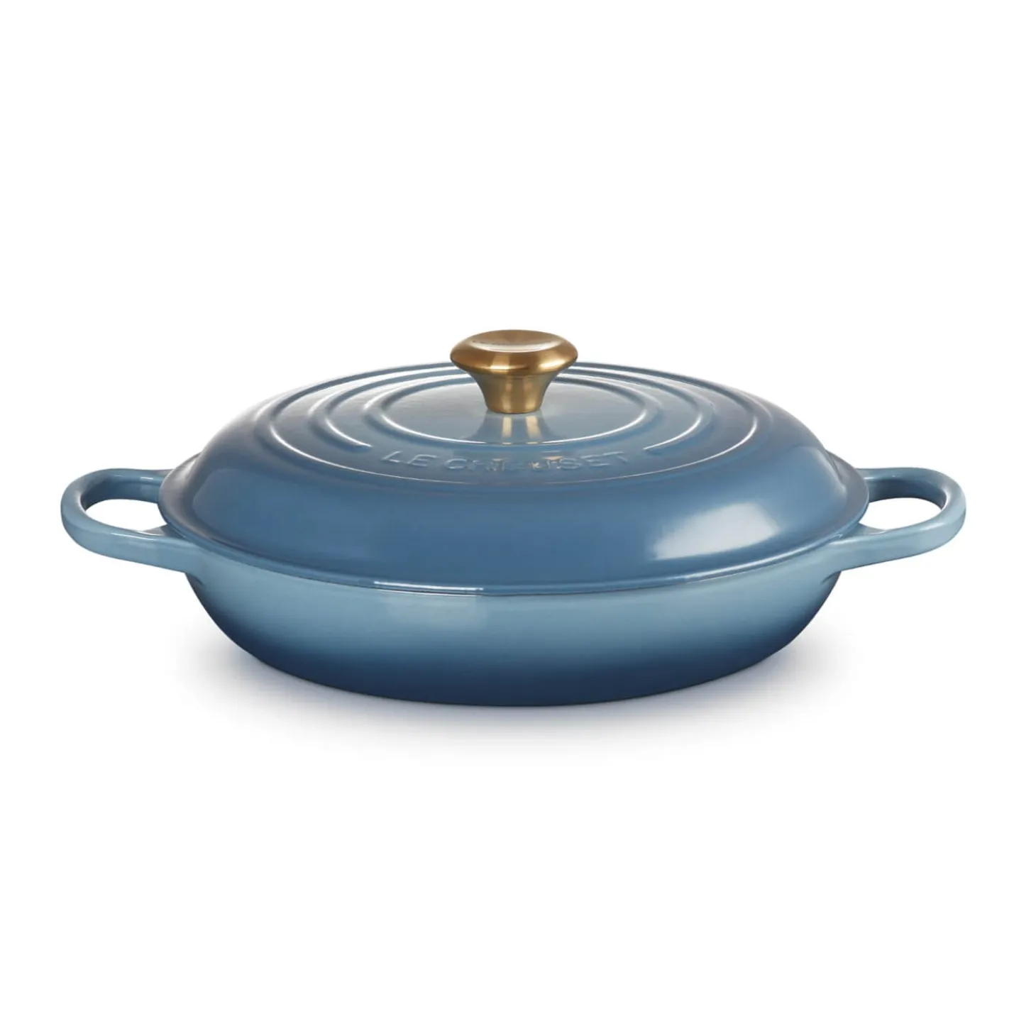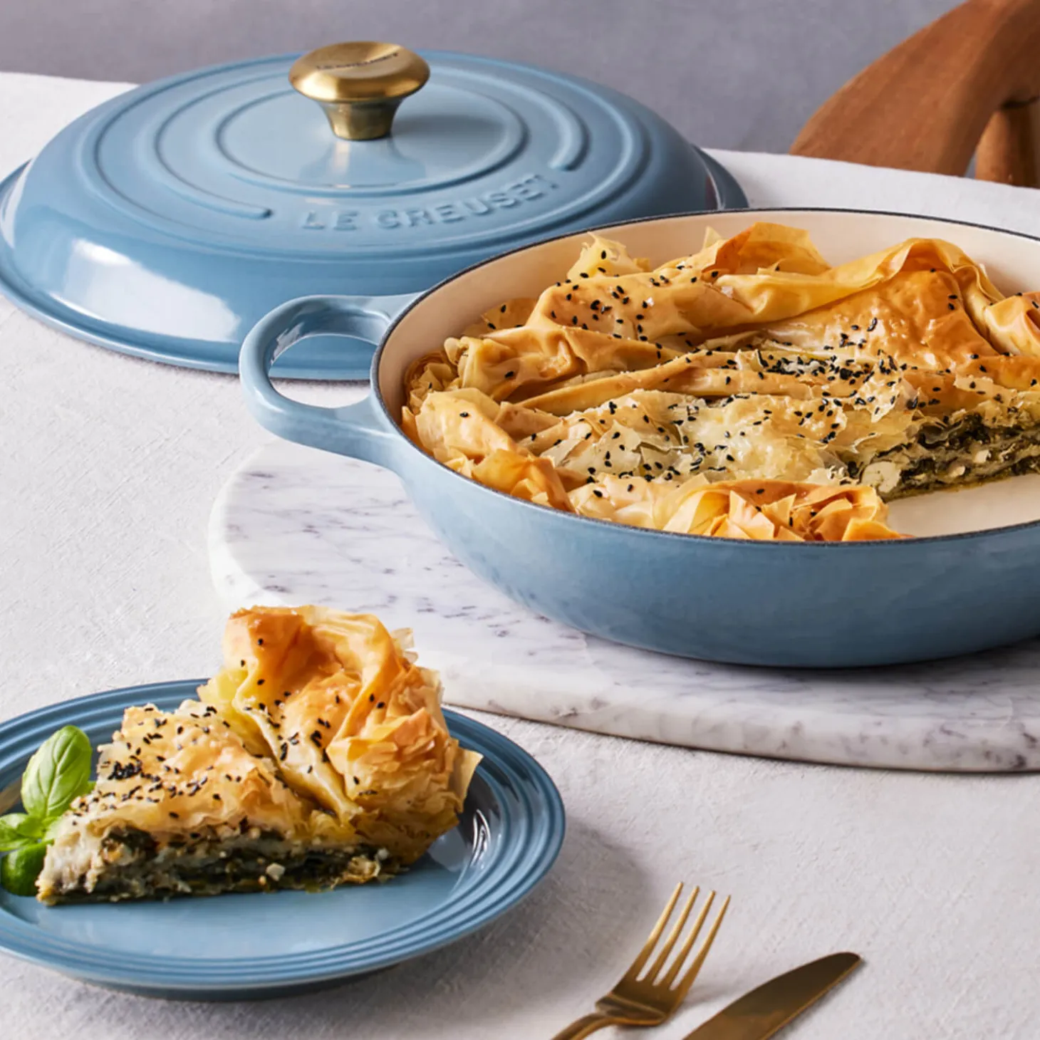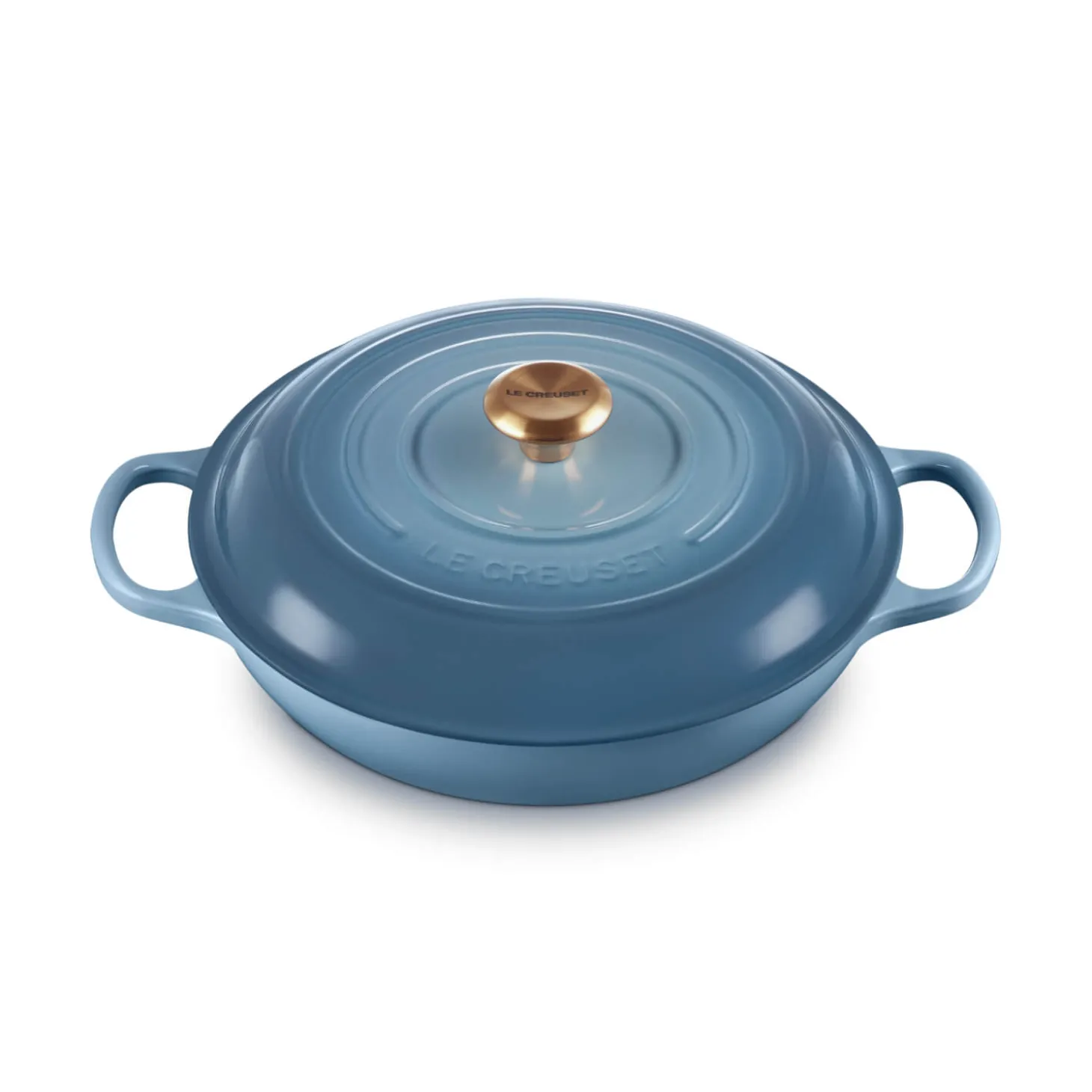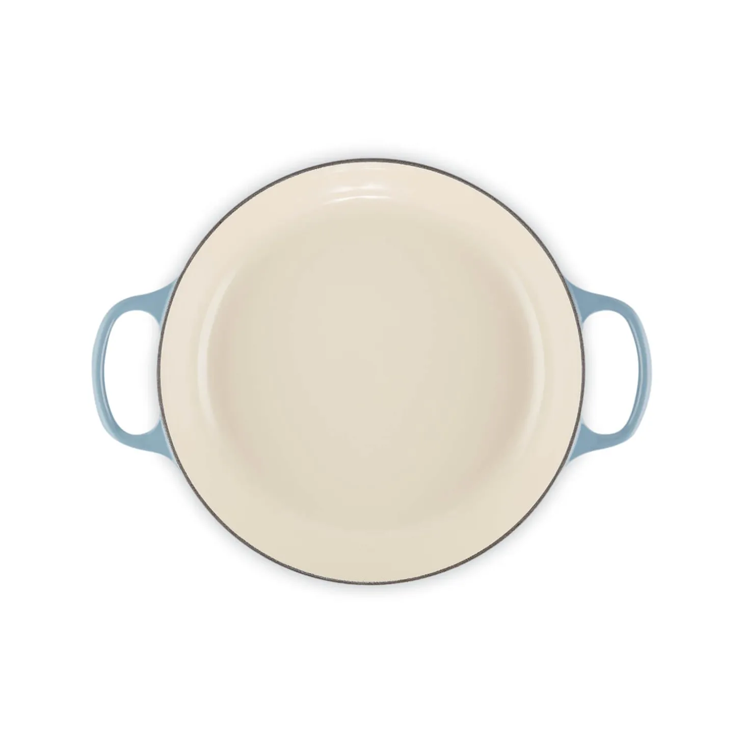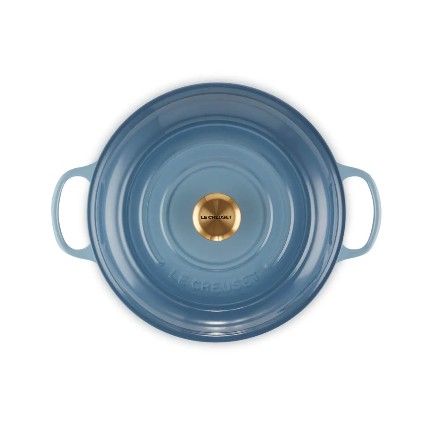 This on-trend Signature cast iron 30cm shallow round casserole by Le Creuset forms part of their Chambray colourway collection, a stunning colour, indulge in the serene ambience of Chambray Blue creating a calming and soothing atmosphere, perfect for a relaxing cooking and dining experience. A versatile and timeless choice this dish can be applied to a variety of recipes including stews, roasts, bread making, soups and much more. Each cast iron piece has been handcrafted in France by skilled craftsmen with an expert enamel finish that is easy to clean and does not absorb stains or odours. These dishes can be used on all hob types including induction and feature an ergonomic stainless steel gold knob with the Le Creuset logo visible on the top. Other shapes, sizes and colours are also available.