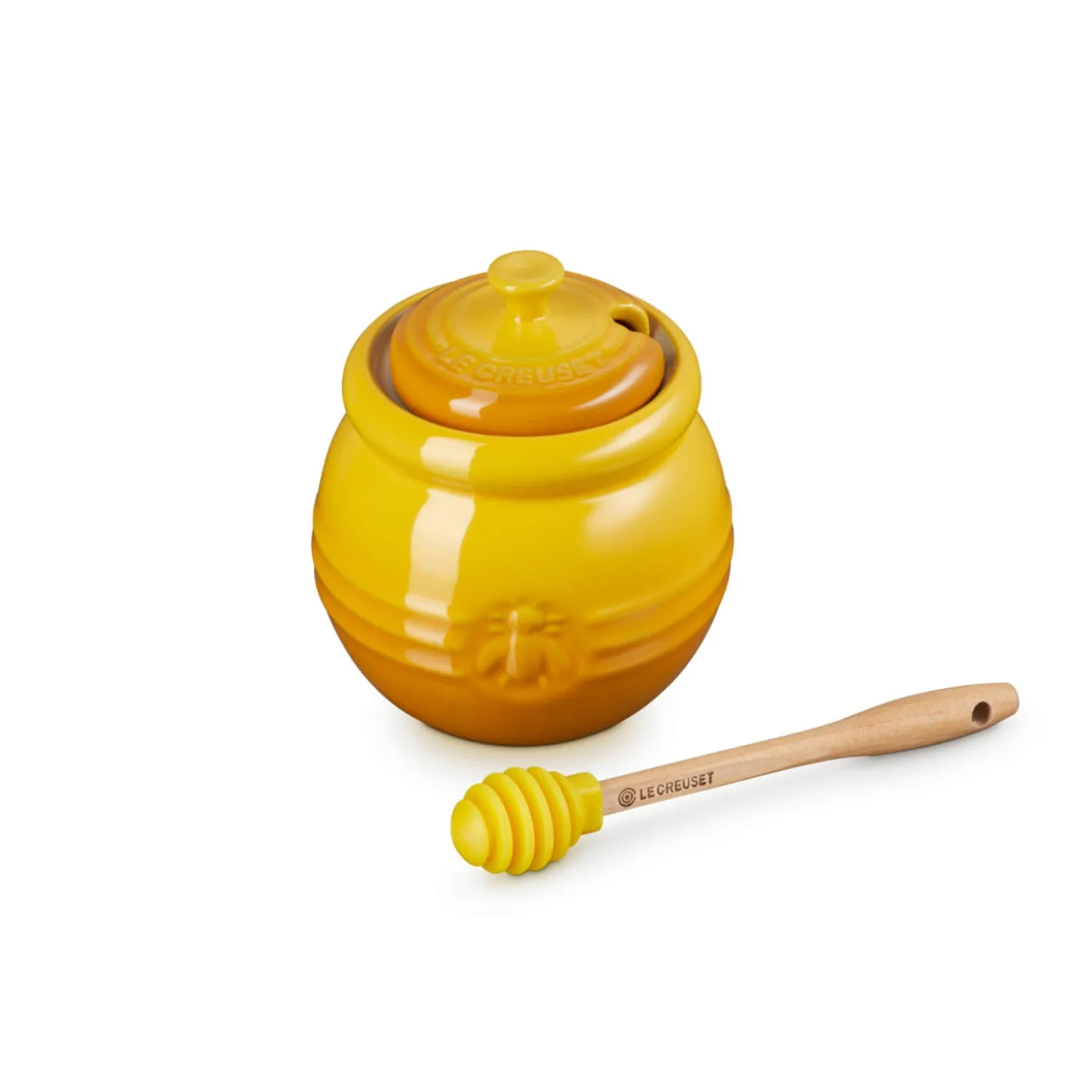 Le Creuset presents the Stoneware Honey Pot & Dipper in Nectar. Ideal for all those that love honey on their toast, the dipper is made with silicone and a wooden handle and allows for drip-free usage. With a high shine, durable and strong enamel surface this honey pot is easy to clean and has the iconic 3 ring styling making it perfect for your breakfast table.
