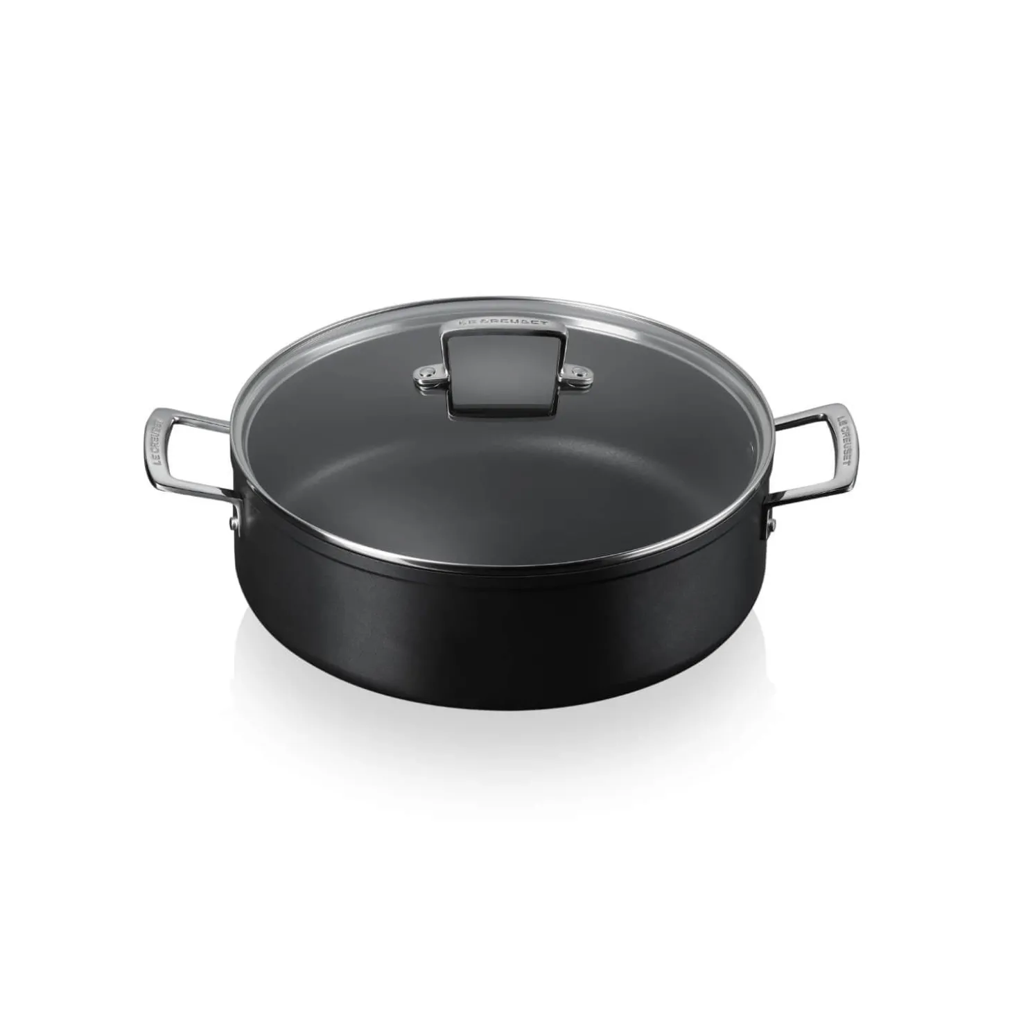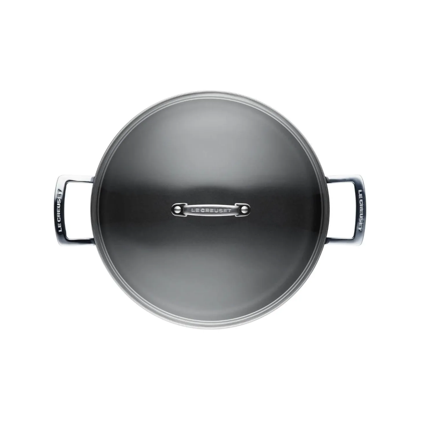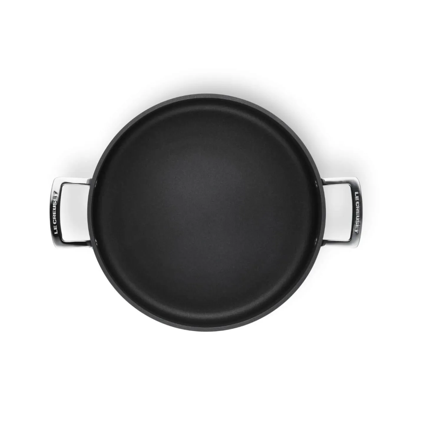 Perfect for a multitude of cooking tasks this versatile 30cm saute pan by Le Creuset forms parts of their improved Toughened Non-Stick range which now feature 4x* as much strength as the previous edition thanks to a 3-layer PFOA free coating. This saute pan also provides excellent heat distribution due to being created using hard anodised aluminium making this saute pan compatible across all hob types including induction. The stainless steel helper handles allow for comfort and easy use with guaranteed stability.