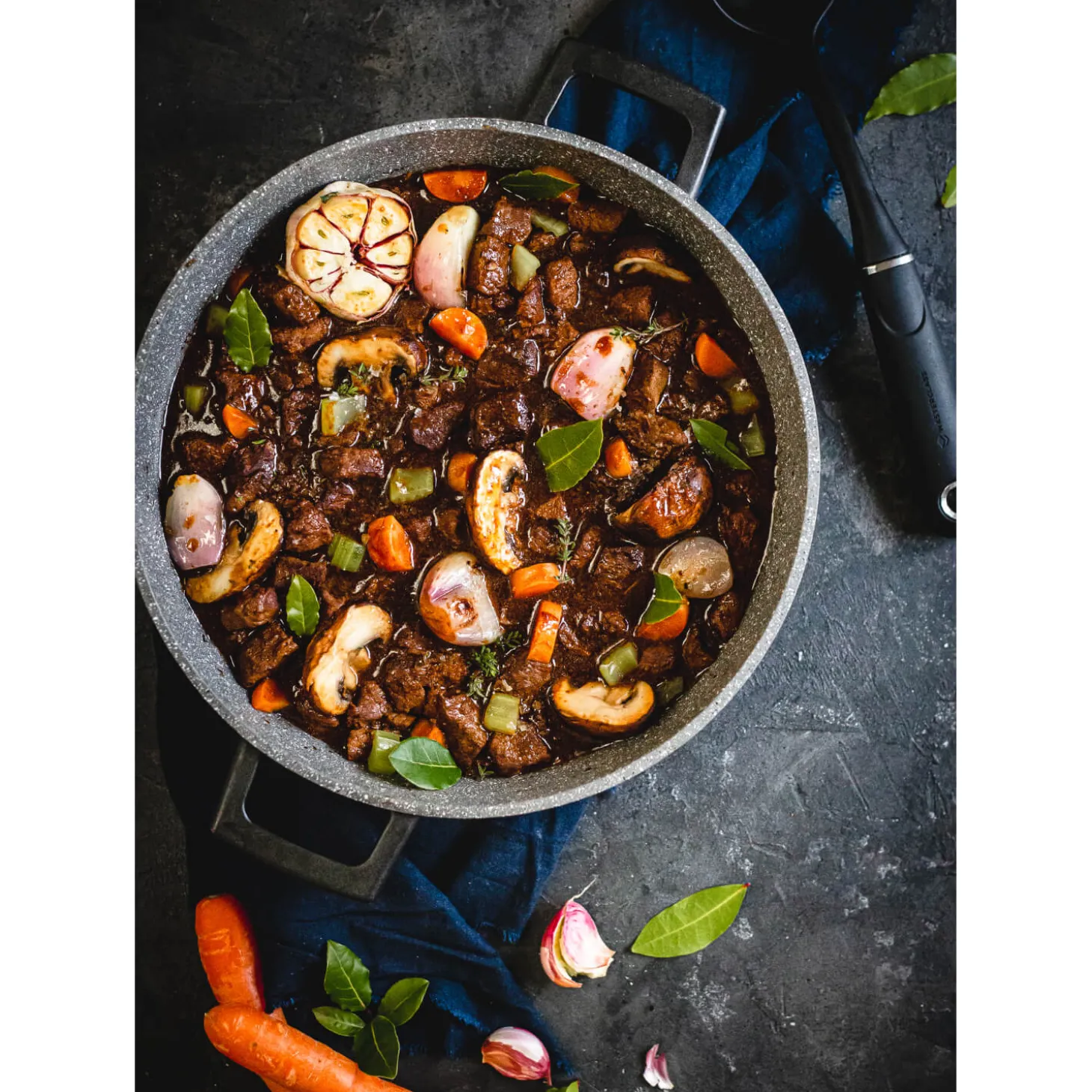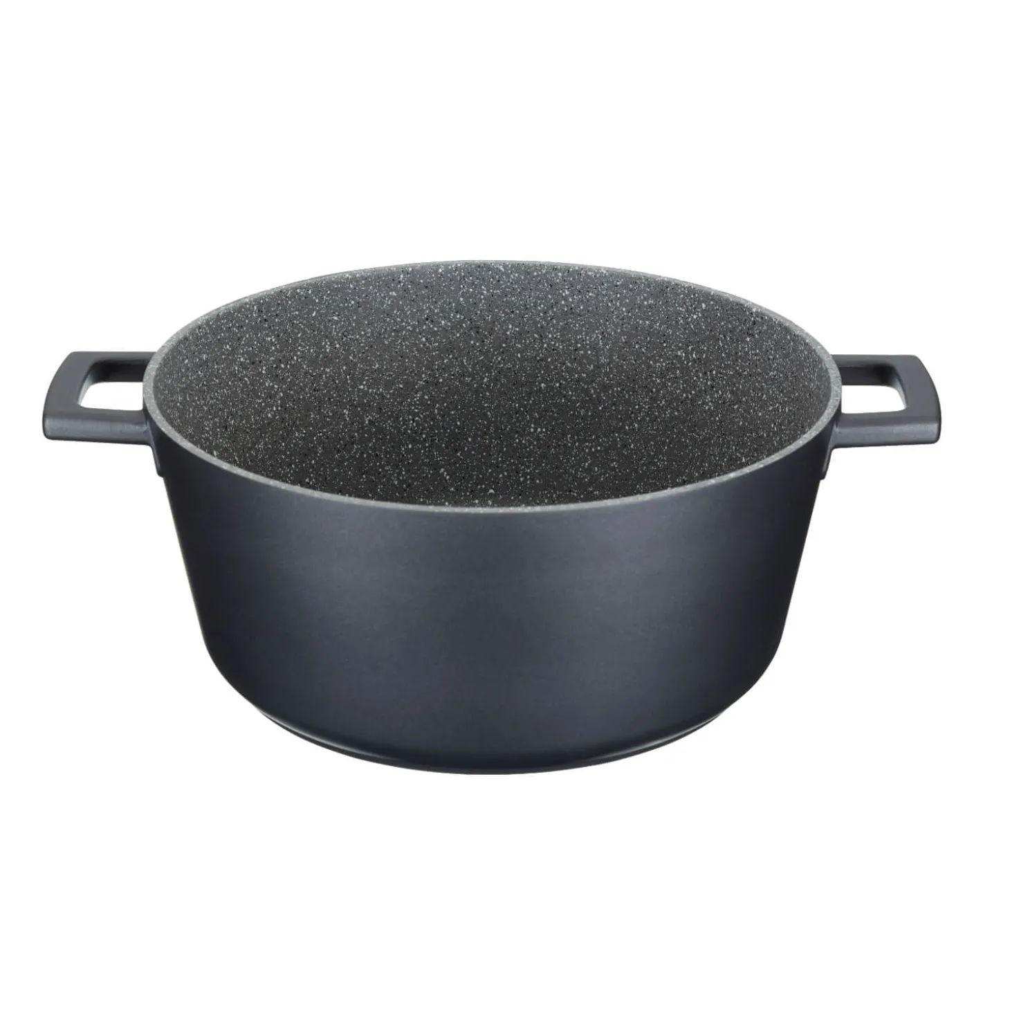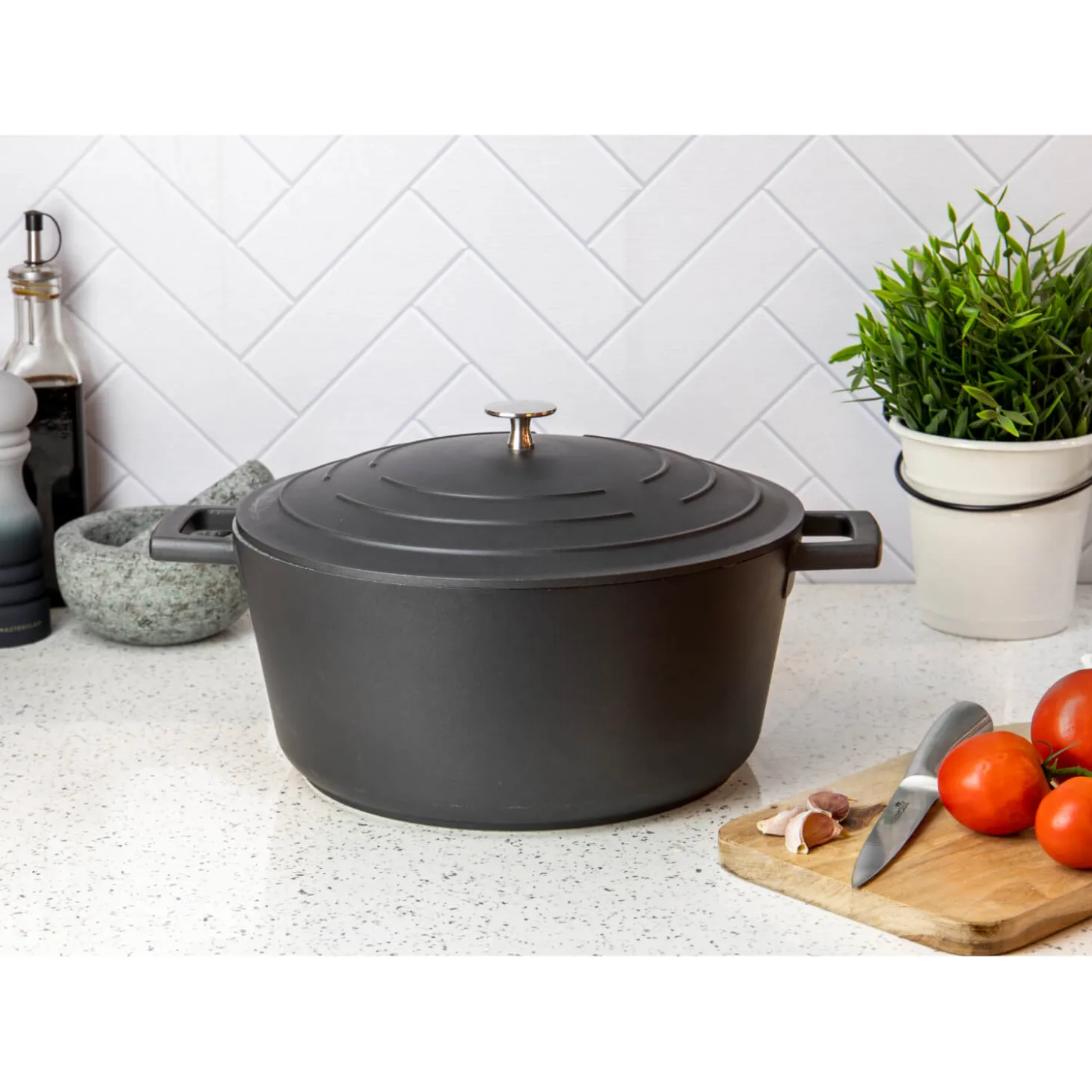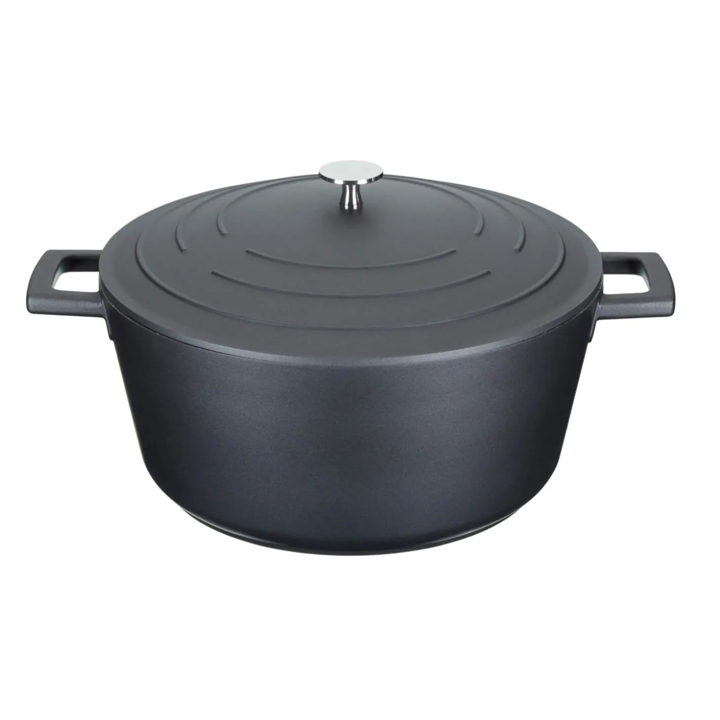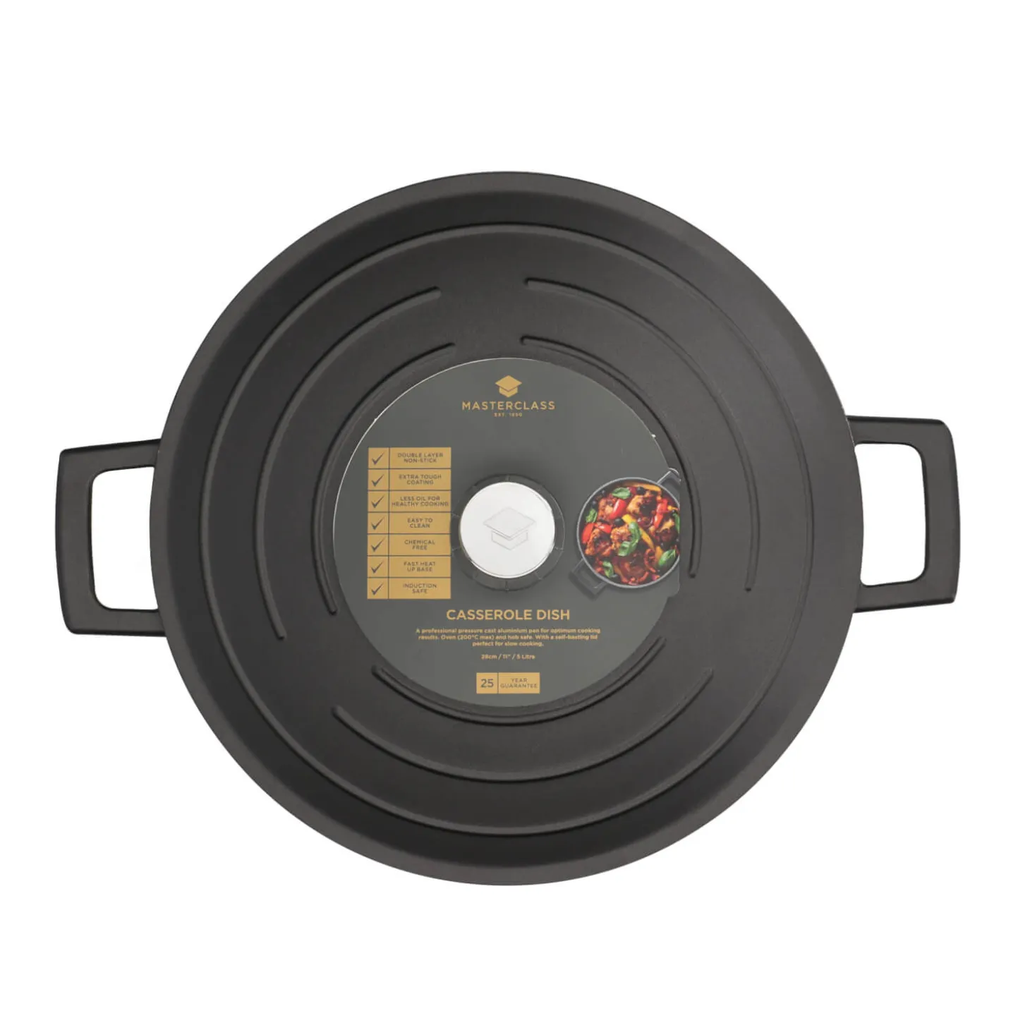 Masterclass presents the 28cm Cast Aluminium Round Casserole Dish in Black from their Lightweight range. Designed to be much lighter than traditional cast iron while maintaining exceptional strength, this dish is perfect for oven or hob cooking, including induction, ensuring fast and even heat distribution. The self-basting lid locks in moisture for rich, flavourful meals, while the durable, reinforced non-stick coating allows effortless food release. An essential casserole for any type and style of kitchen.Â