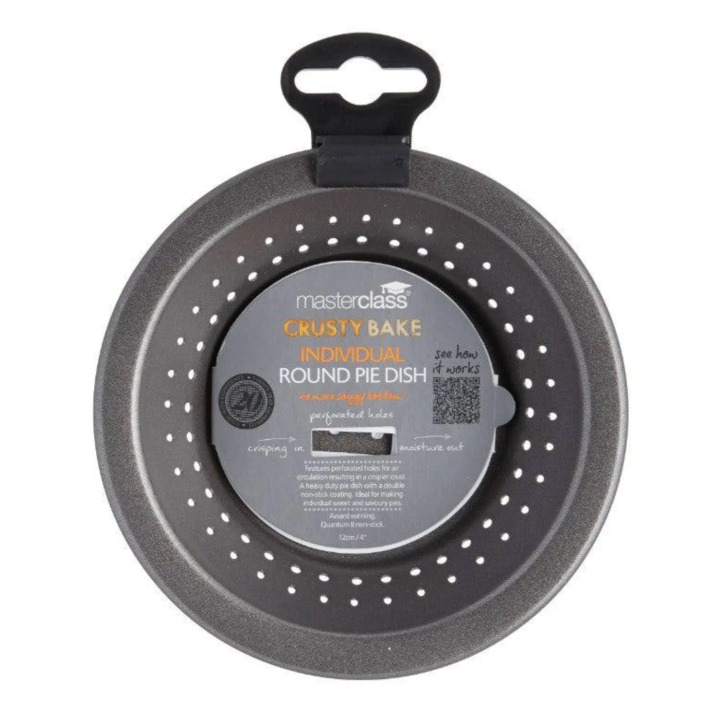 - Treat yourself and your loved ones to delicious individual pies using the Kitchencraft Masterclass 10cm Round Non-Stick Crusty Bake Pie Dish. The innovative perforated design allows the air to circulate around the crust, helping to avoid those dreaded soggy bottoms! The Quantum 2 non-stick coating aids quick and easy removal, making it the perfect little dish for a variety of sweet and savoury pies.