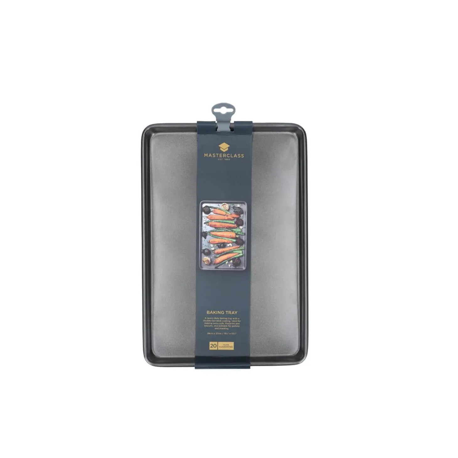 The Kitchencraft Masterclass 39cm Rectangle Non-Stick Baking Tray is suitable for baking, grilling or roasting a wide range of food items and allows other baking trays from the same range (sold separately) to fit inside, making it useful for cooking food items at the same time whilst avoiding cross-contamination. Made from heavy duty carbon steel with a non-stick coating, this is a quality kitchen item that should stand the test of time to become an old kitchen faithful.