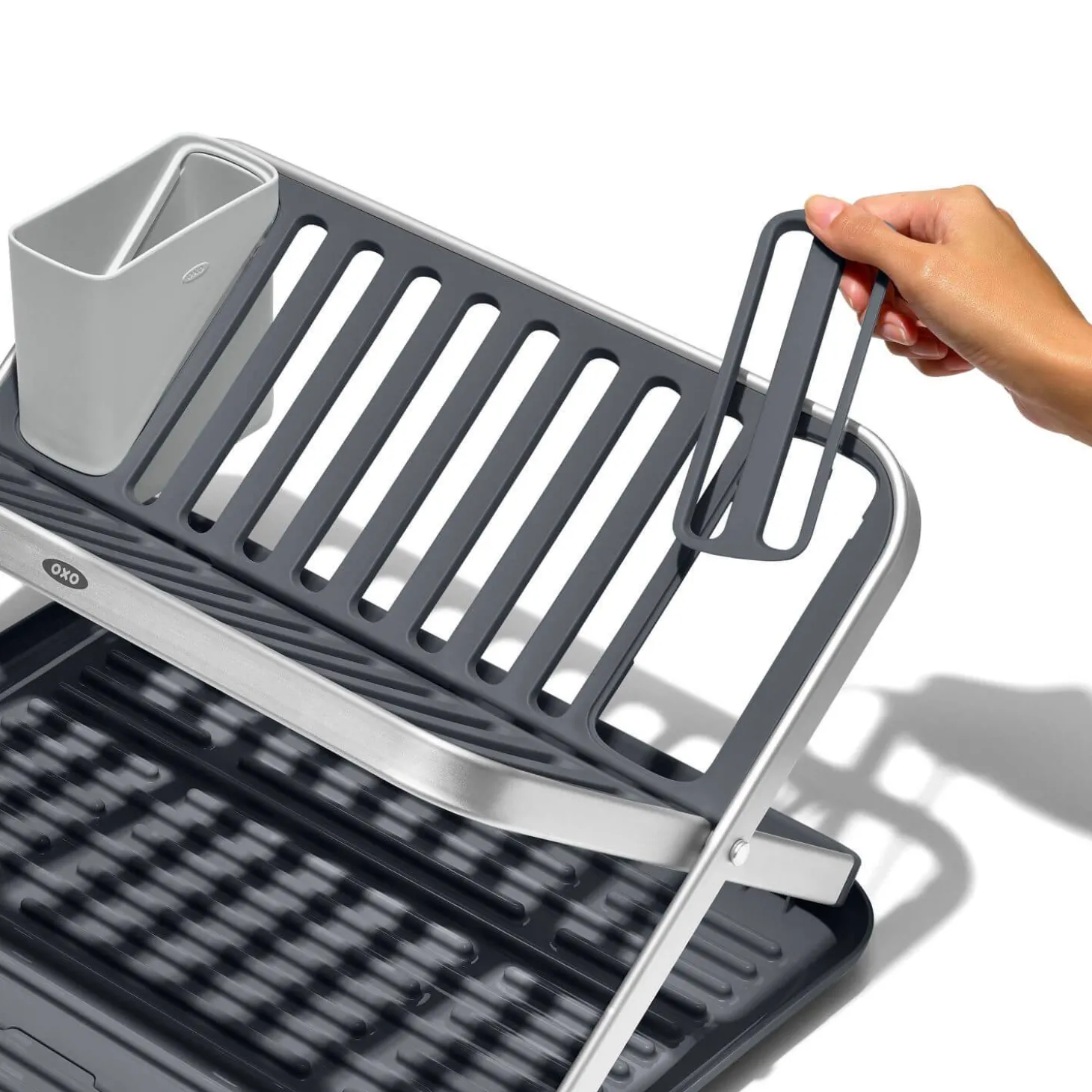 Space-saving and practical is this Aluminium Fold Flat Dish Rack in Grey by OXO Good Grips. The frame of this dish rack is made from aluminium which is rustproof, the draining board has ridges to allow water to drain away and the non-slip feet ensure stability on your countertop. This dish rack folds flat for draining small amounts of items and is easily stored away when not in use. A stylish dish rack for all kitchens.