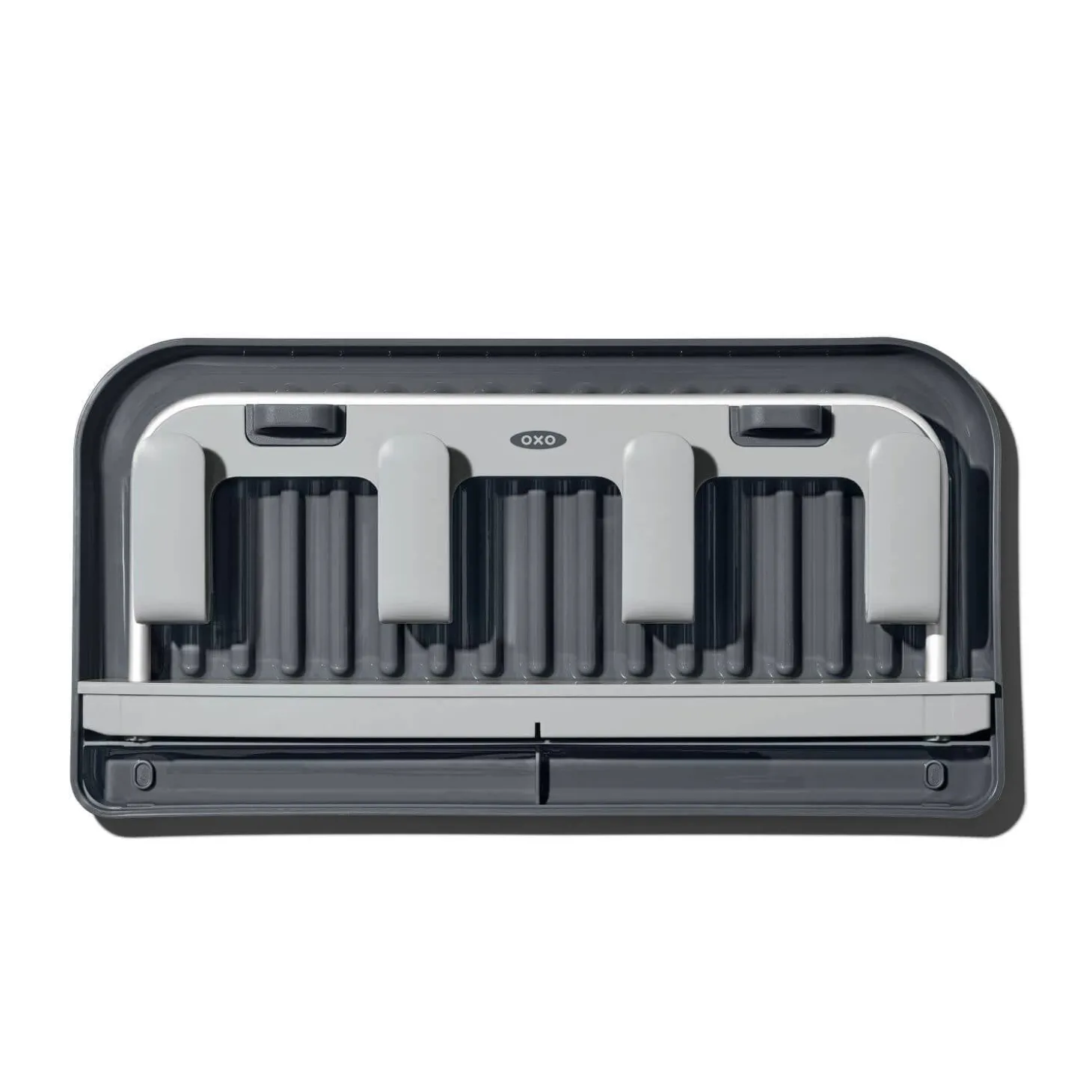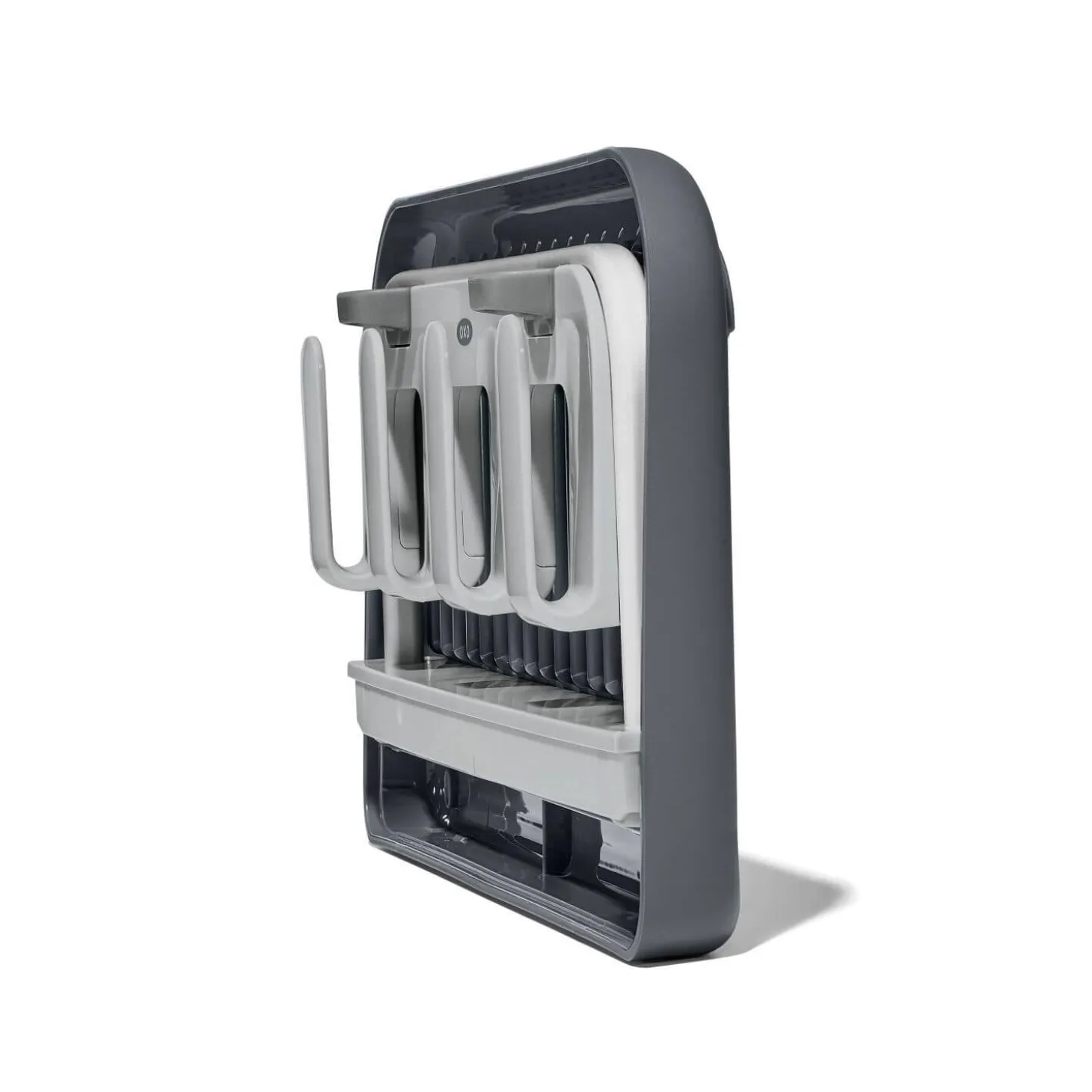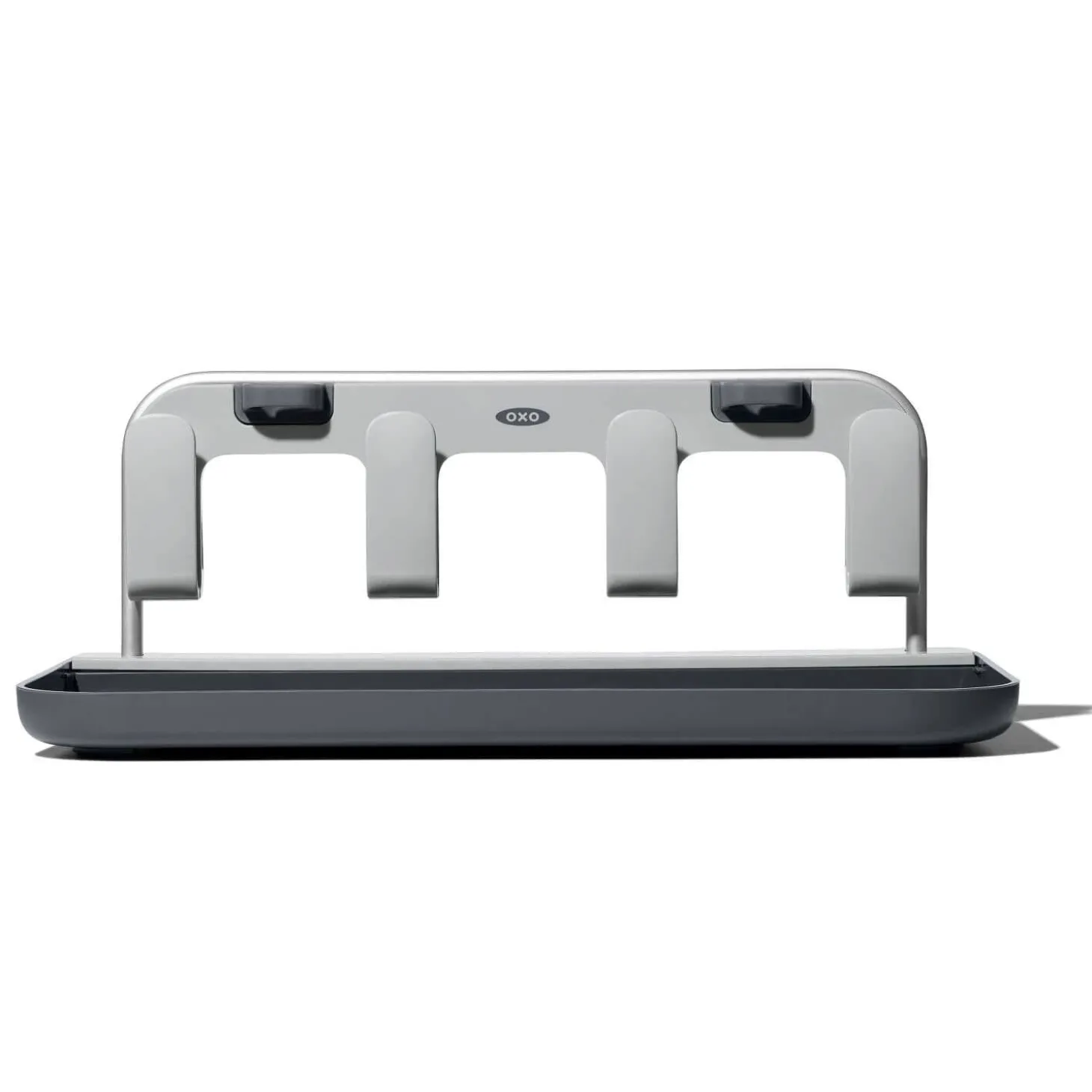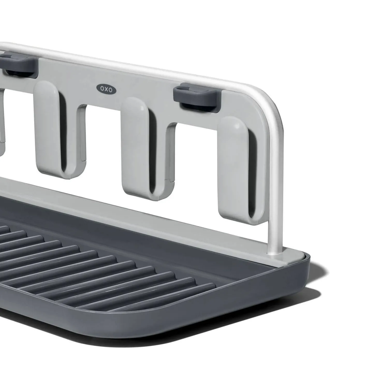 A clever and unique design by OXO Good grips is this Aluminium Water Bottle Drying Rack in Grey is extremely practical, the rack can hold up to four bottles and lids, it is suitable for travel mugs and has four straw holders for you to be able to drain and dry your reusable straws hygienically. This bottle drying rack neatly comes apart for easy compact storage. A great way to drain and dry all your reusable bottles, mugs and accessories.