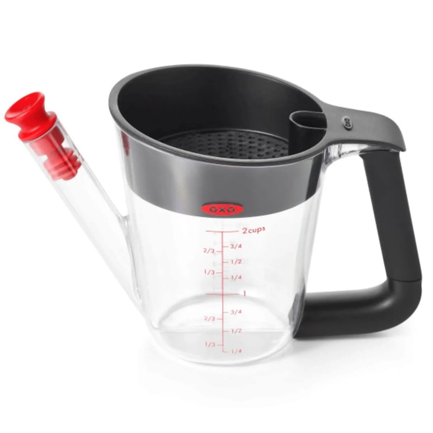 The 500ml OXO Good Grips Fat Separator Jug is an innovative way of keeping flavour in your gravy and the fat out. By placing the stopper in the spout and when you pour pan drippings into the jug, the strainer will hold back unwanted cooking debris and the fat will rise to the top in the jug. Simply remove the stopper and store in the handy stopper hub, then pour your gravy leaving the fat behind. With easy to read measurement markings, and a splatter shield to help prevent splashing while you pour, create delicious gravy every time. Dishwasher safe.