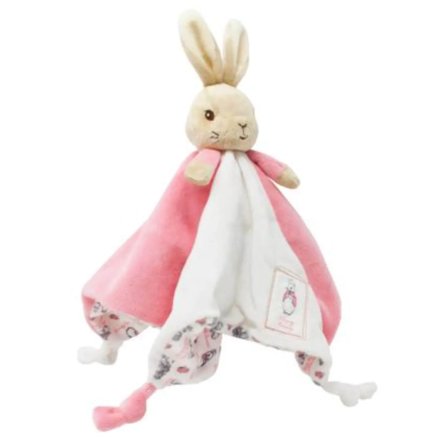 Presenting the Flopsy Bunny Comfort Blanket, inspired by the much-loved character from the classic tales created by Beatrix Potter. Suitable from birth and crafted from luxuriously soft fabric, this blanket is perfect for cosy snuggles at bedtime or storytime. Featuring an adorable bunny motif and knotted corners to encourage sensory play, this beautiful comforter makes an ideal first companion for little ones.