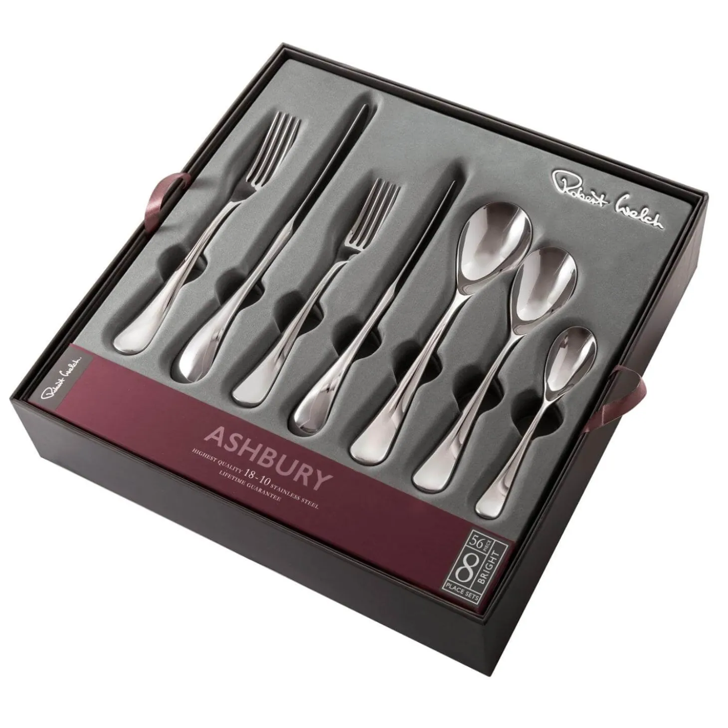 Robert Welch presents the Ashbury Bright 56-Piece Cutlery Set. The sleek design of the cutlery contrasts beautifully with the modern silhouette of the dining table. The gentle upward curve at the ends of the fork and spoon handles mirrors the downward curve of the knife handle. Made from specially forged hardened stainless steel, this cutlery set is resistant to rust and corrosion, making it ideal for both special occasions and everyday use.