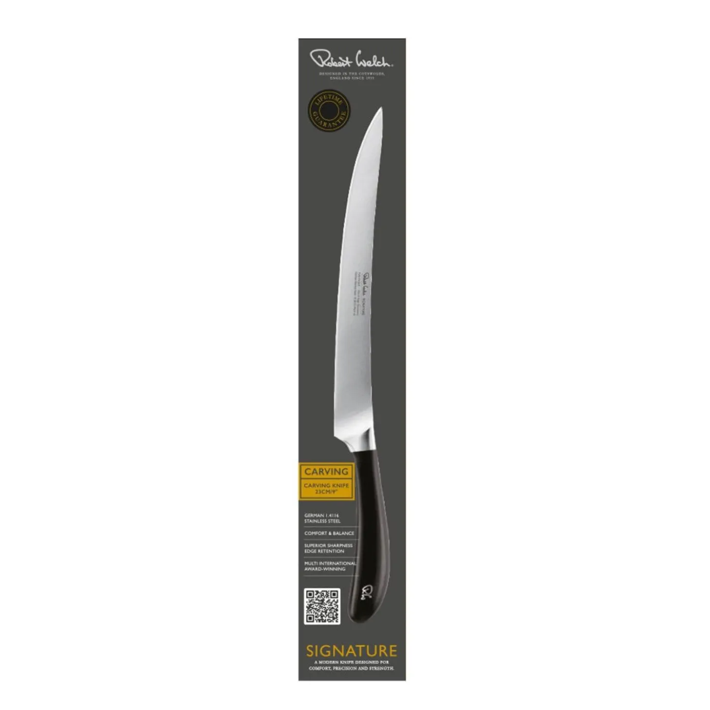 This 23cm Carving knife forms part of the Signature kitchen knife range by Robert Welch. Each item in the collection has been designed with comfort, precision and strength in mind, created from a single billet of German stainless steel with a hand-sharpened finish of 15° for exceptional sharpness. Includes a lifetime guarantee.