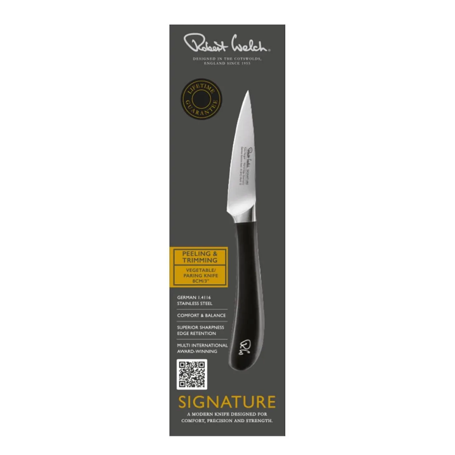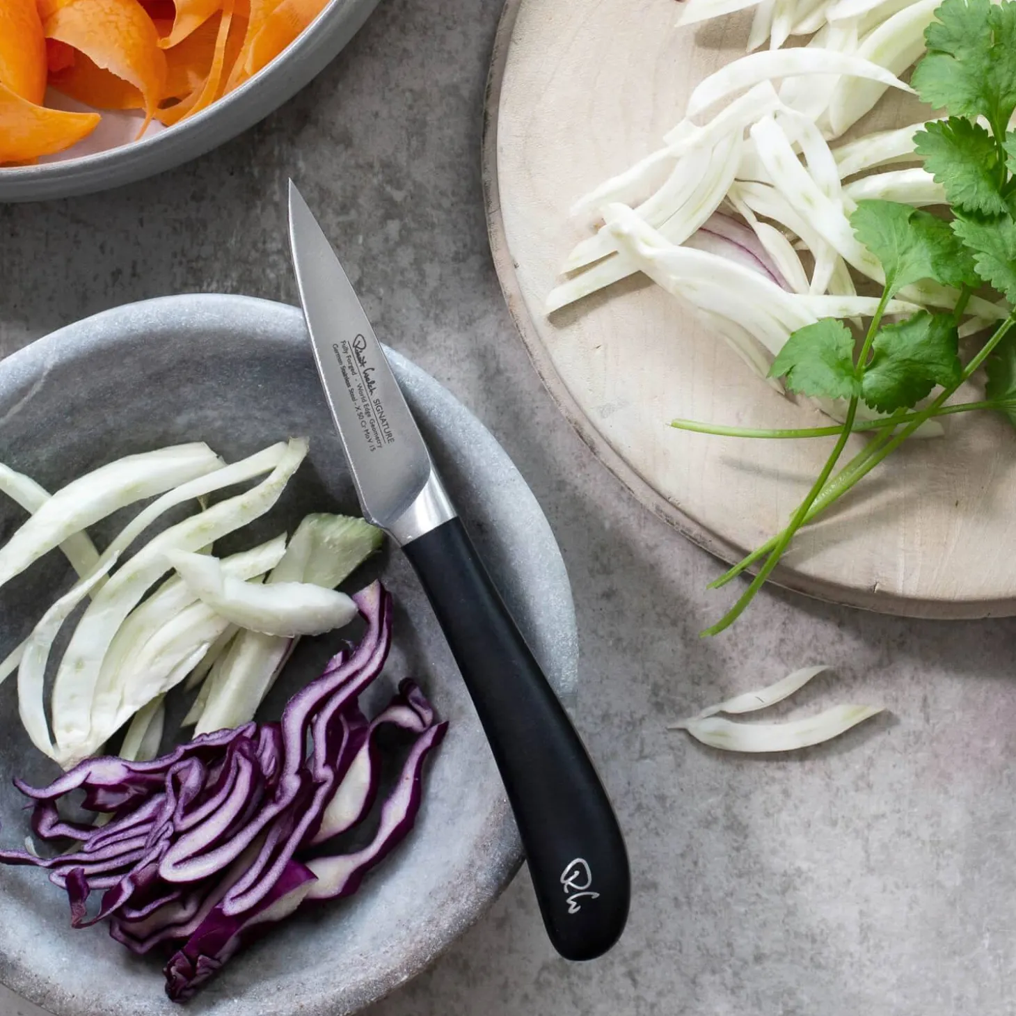 This 8cm Paring knife forms part of the Signature kitchen knife range by Robert Welch. Each item in the collection has been designed with comfort, precision and strength in mind, created from a single billet of German stainless steel with a hand-sharpened finish of 15° for exceptional sharpness. Includes a lifetime guarantee.