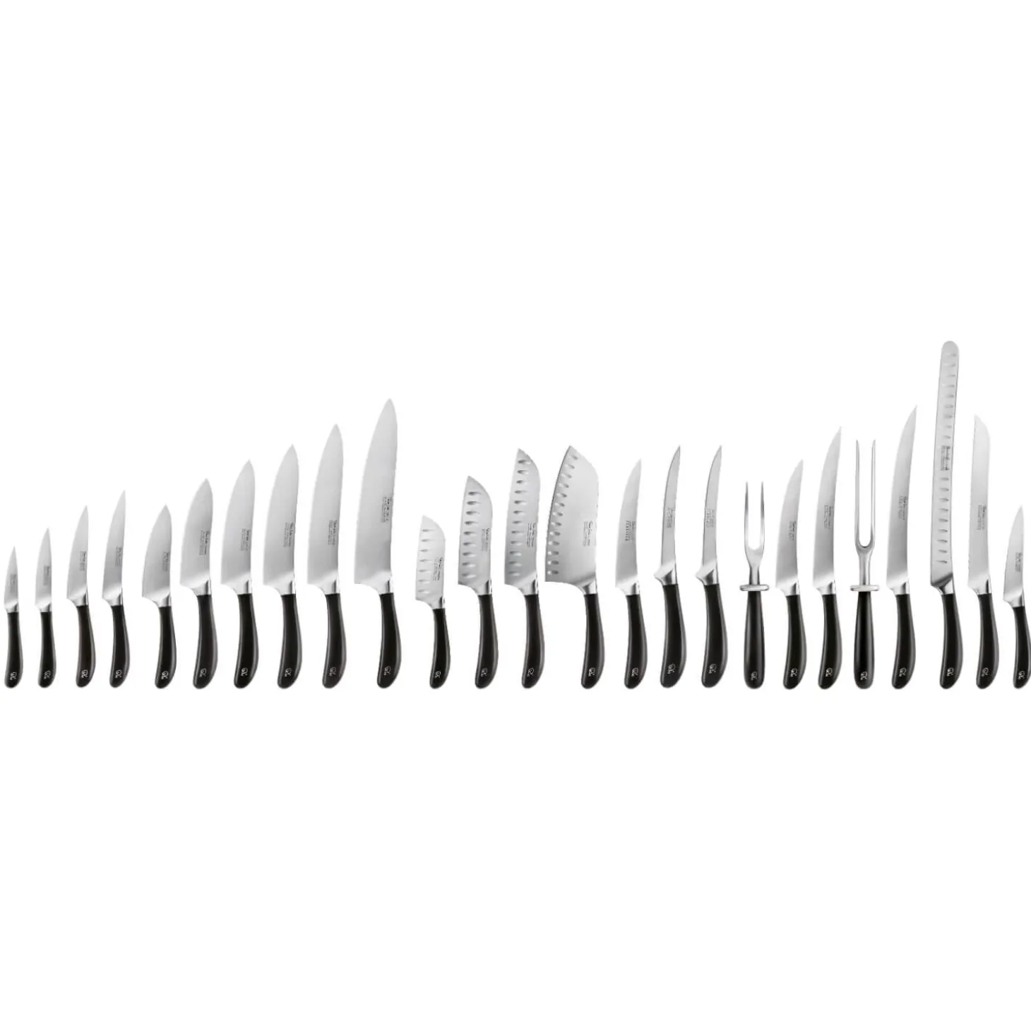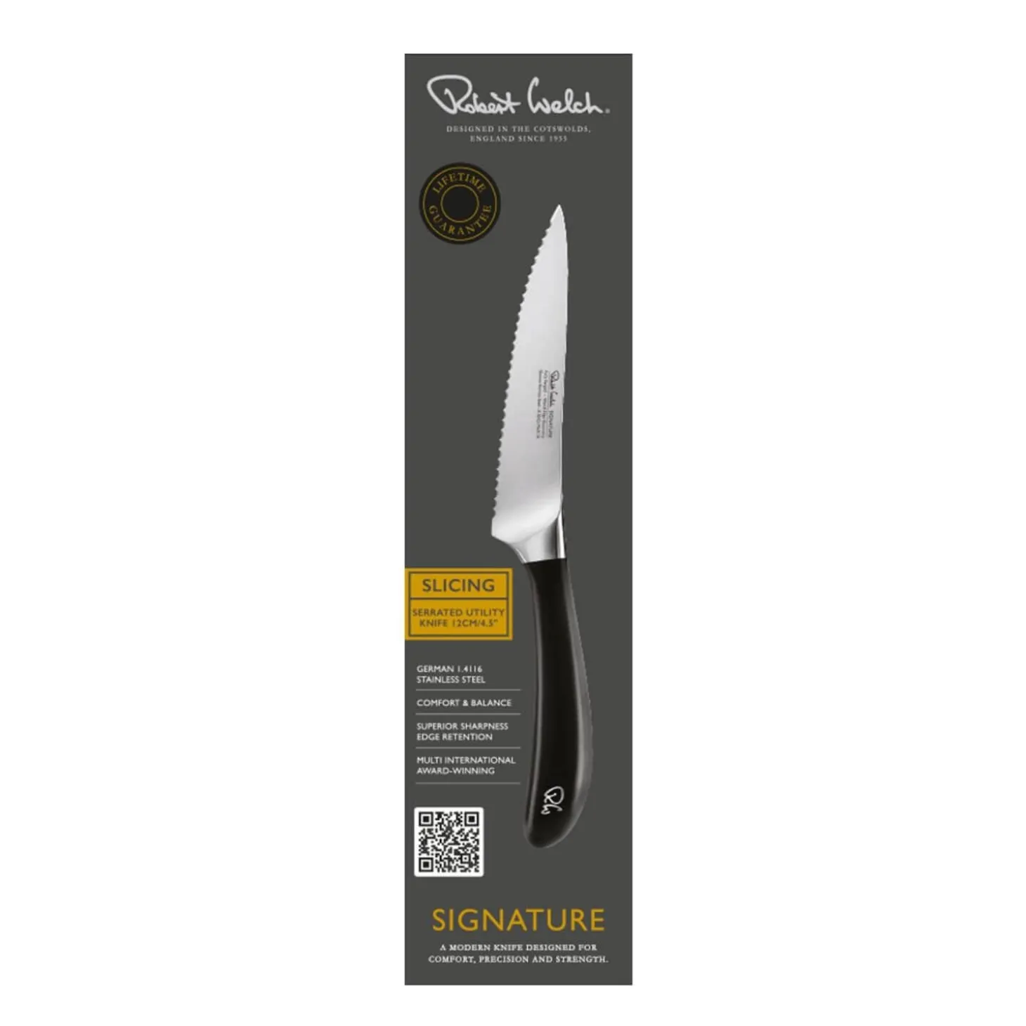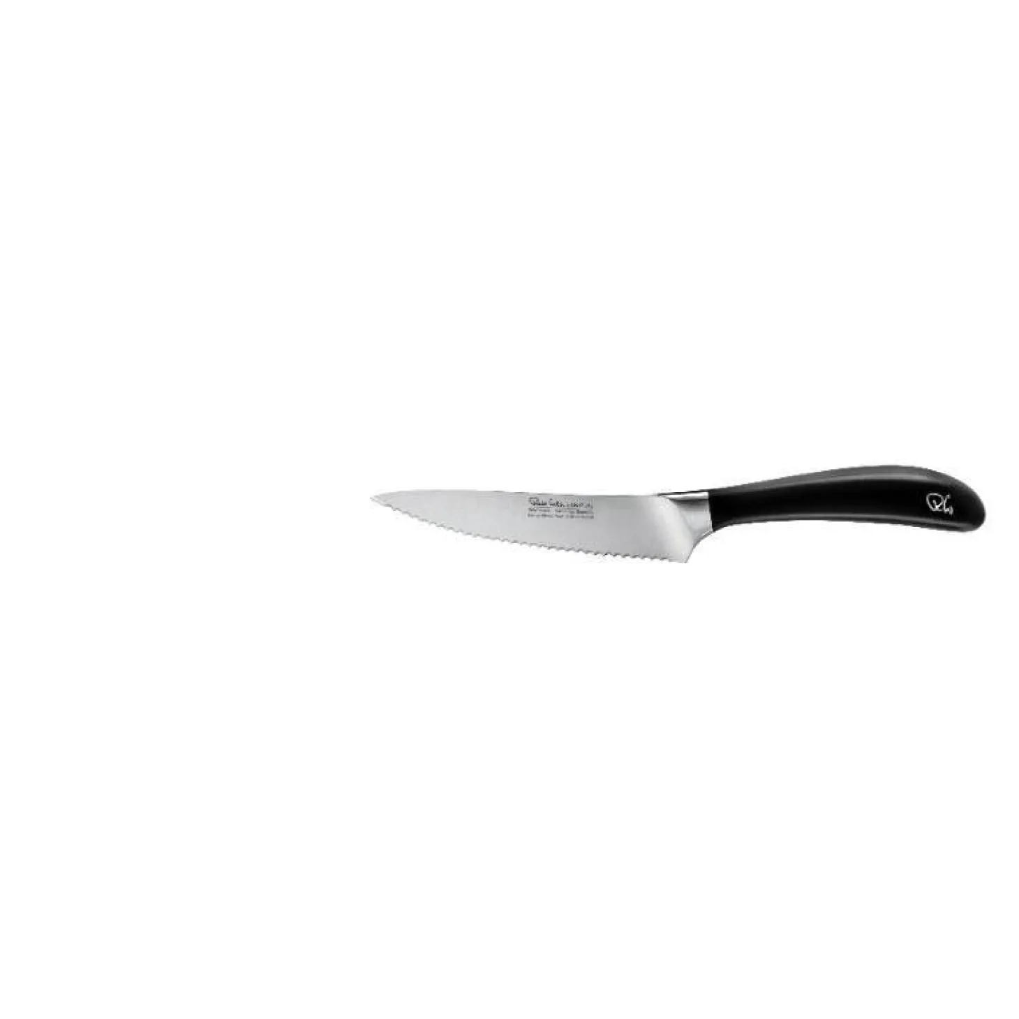 This 12cm Utility knife forms part of the Signature kitchen knife range by Robert Welch. Each item in the collection has been designed with comfort, precision and strength in mind, created from a single billet of German stainless steel with a hand-sharpened finish of 15° for exceptional sharpness. Includes a lifetime guarantee.