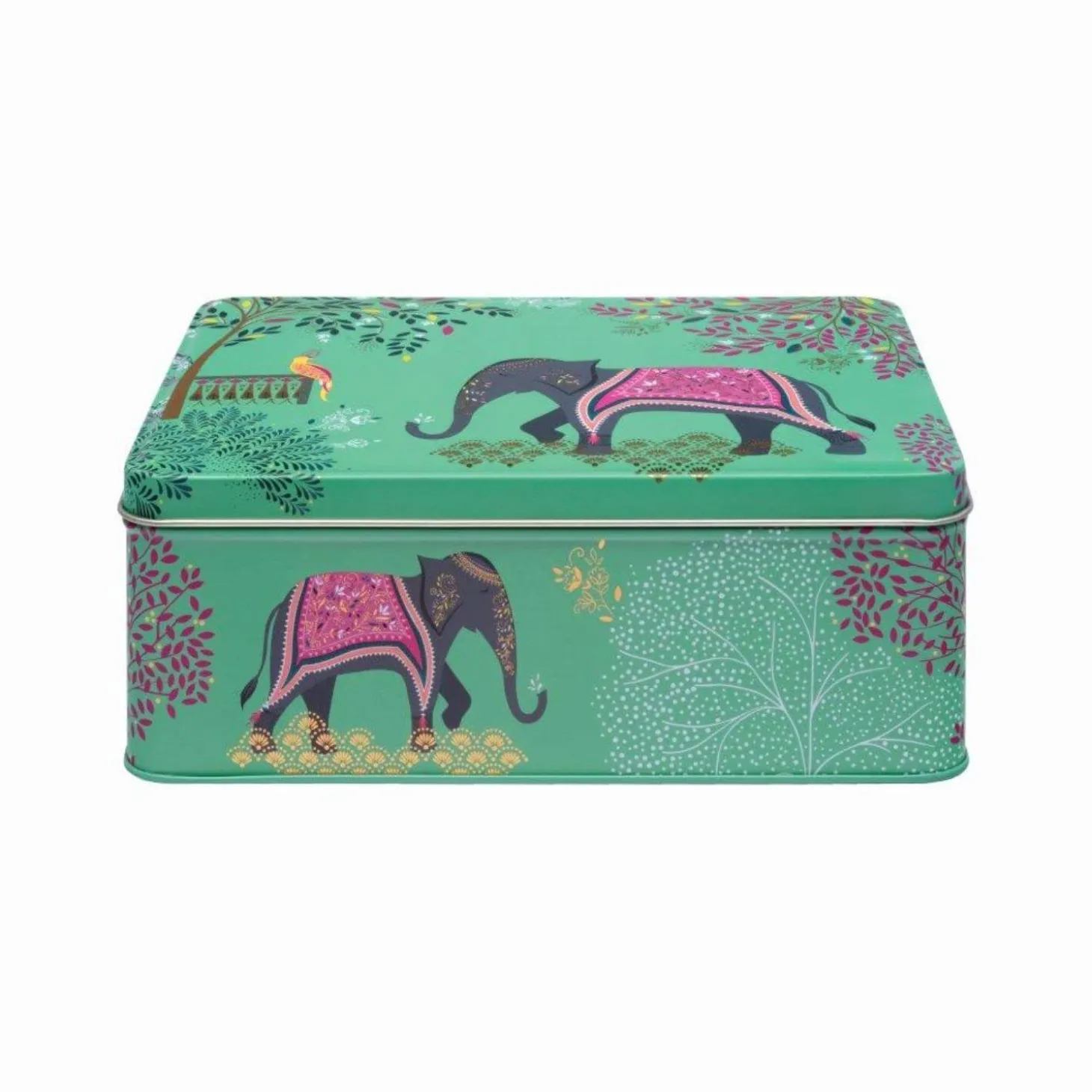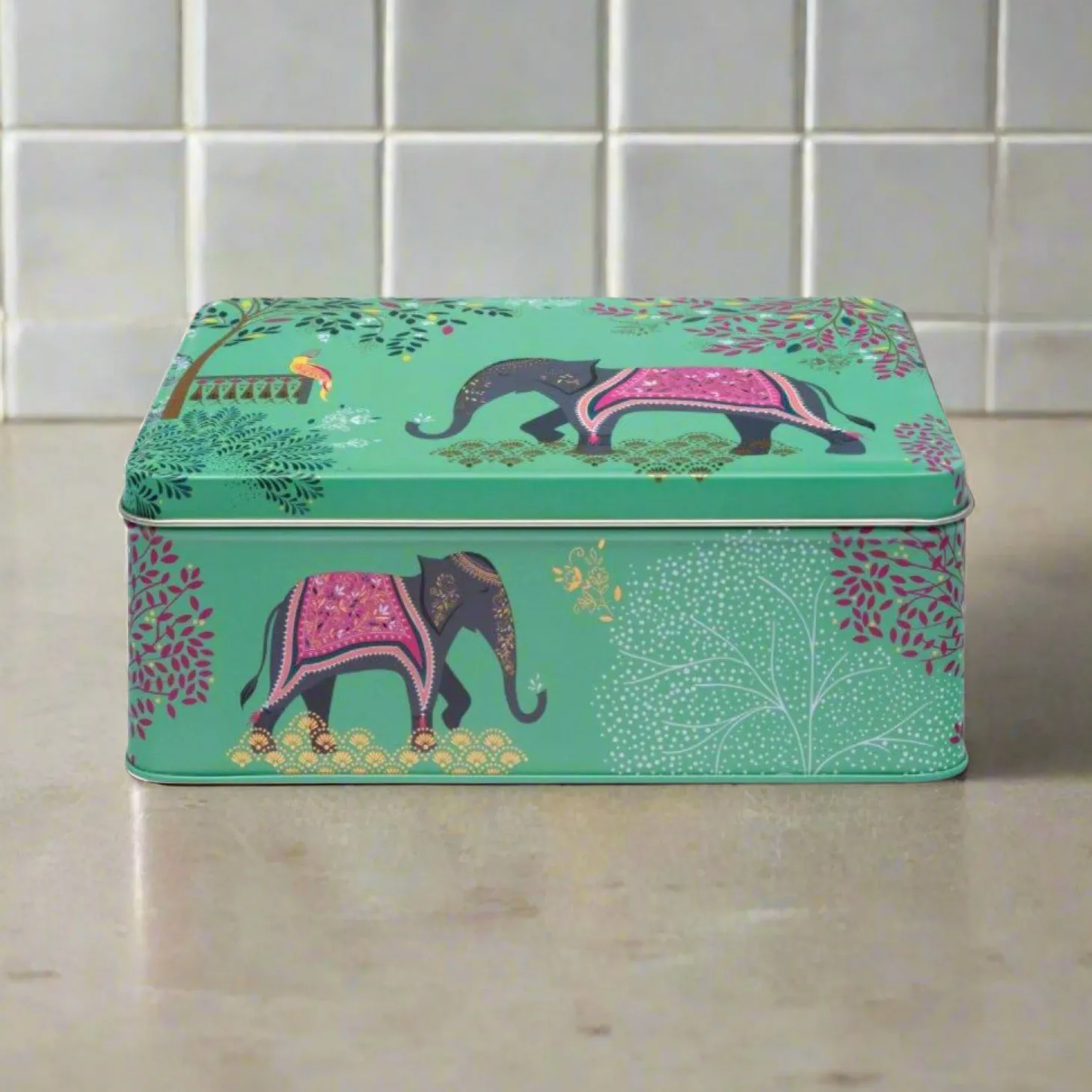 Sara Miller London presents the ‘Elephant’ Deep Rectangular Storage Tin as part of her India collection. Beautifully decorated in vibrant colours showing stunning elephants on a green background with luxurious golden accents. This lovely tin is ideal for storing biscuits, snacks, cakes or even memorabilia and trinkets. This lovely tin would make an ideal gift or a treat for yourself.
