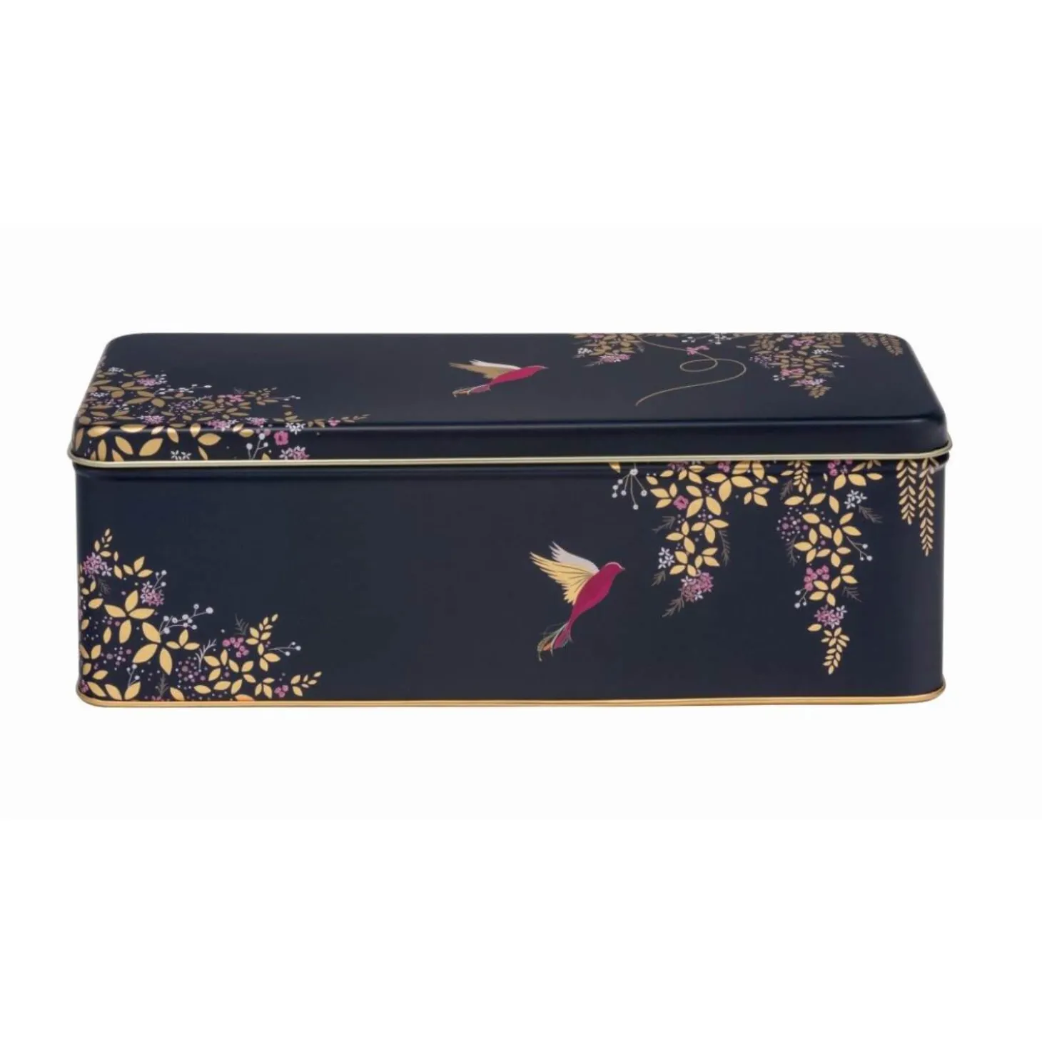 Sara Miller London presents the Long Deep Rectangular Storage Tin in the Navy Hummingbird design. Beautifully decorated with pretty foliage and hummingbirds with stunning gold accents, this colourful tin is ideal for storing snacks, biscuits, keepsakes, trinkets and more, making it an ideal gift or treat for yourself.
