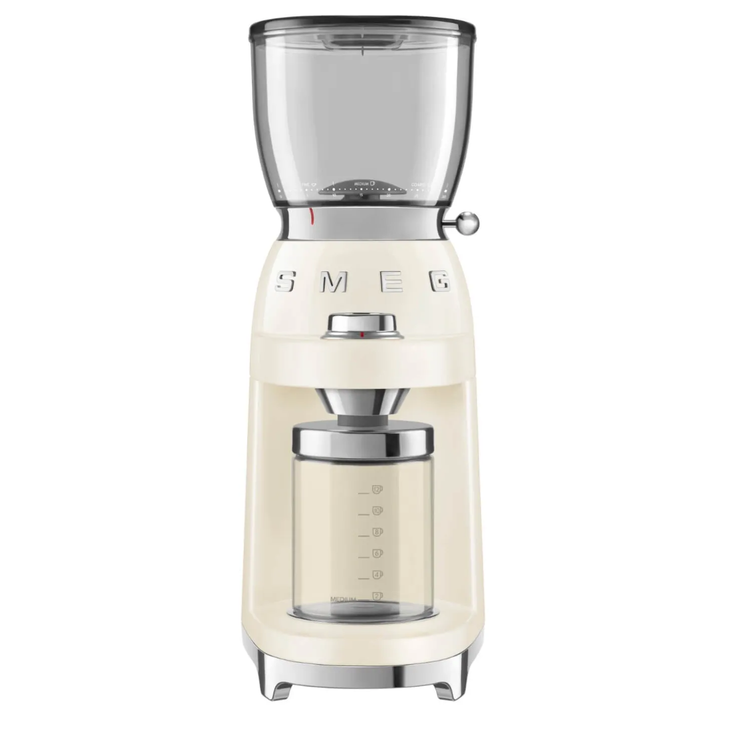 Smeg presents the CGF11 Coffee Grinder in Cream, part of their Retro Style range. The grinder features a large, easy-fill 350g Tritan bean hopper, holding enough beans for approximately 21 cups of coffee or up to 50 espresso shots. The hopper and burr employ a convenient “twist and lock” system for effortless removal and cleaning. With 8 pre-set dispensing levels, you can select from a single or double shot for espressos, or up to 12 cups across fine, medium, and coarse grinds, this lets you achieve the perfect grind for espresso machines and mocha stovetop pots. A terrific coffee grinder for all coffee lovers.