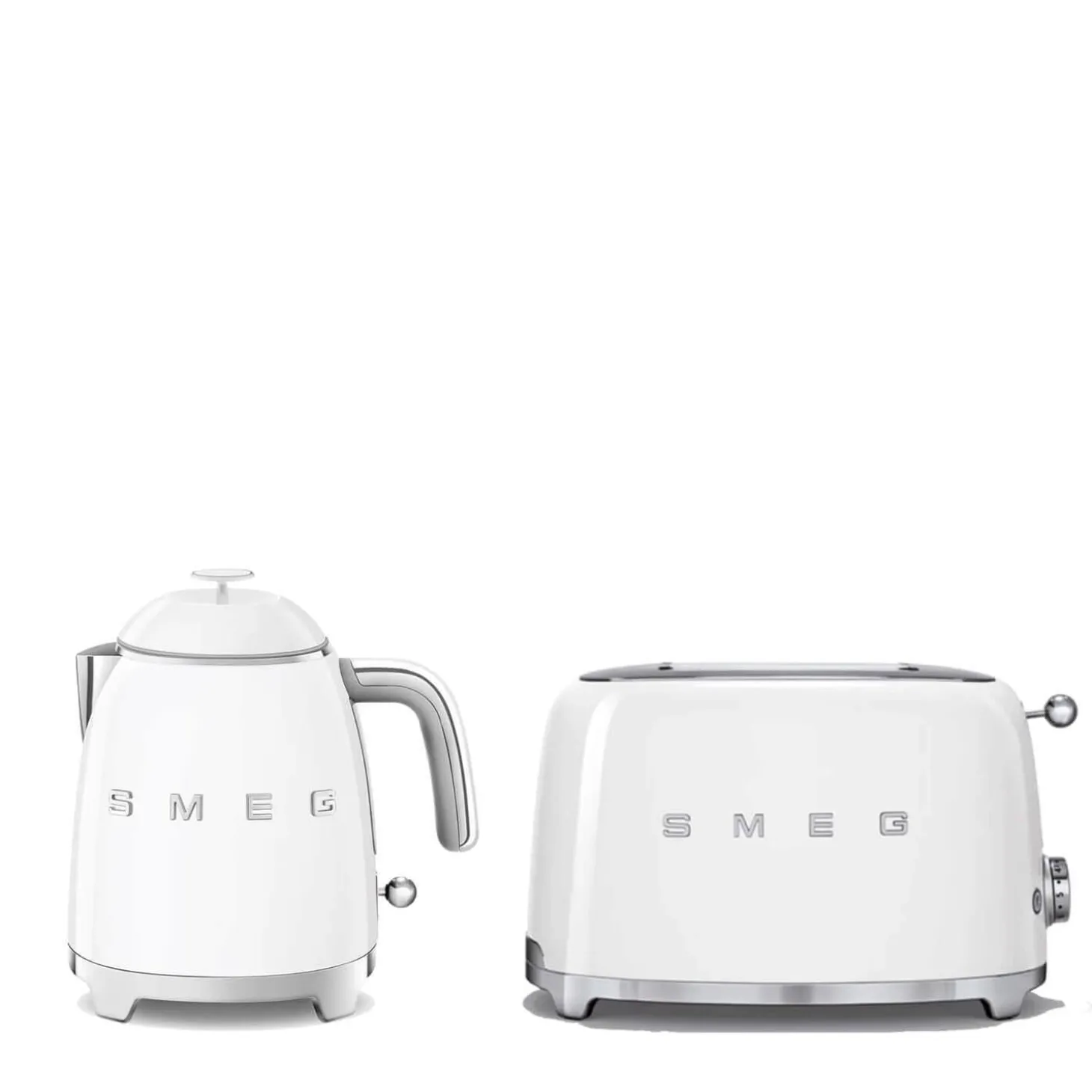 Each item in the Smeg mini white kettle and toaster set features a retro 50’s style exterior with a stylish on-trend glossy white finish with silver accents and a unique raised 3D logo. This set includes a two-year guarantee and are also available individually.