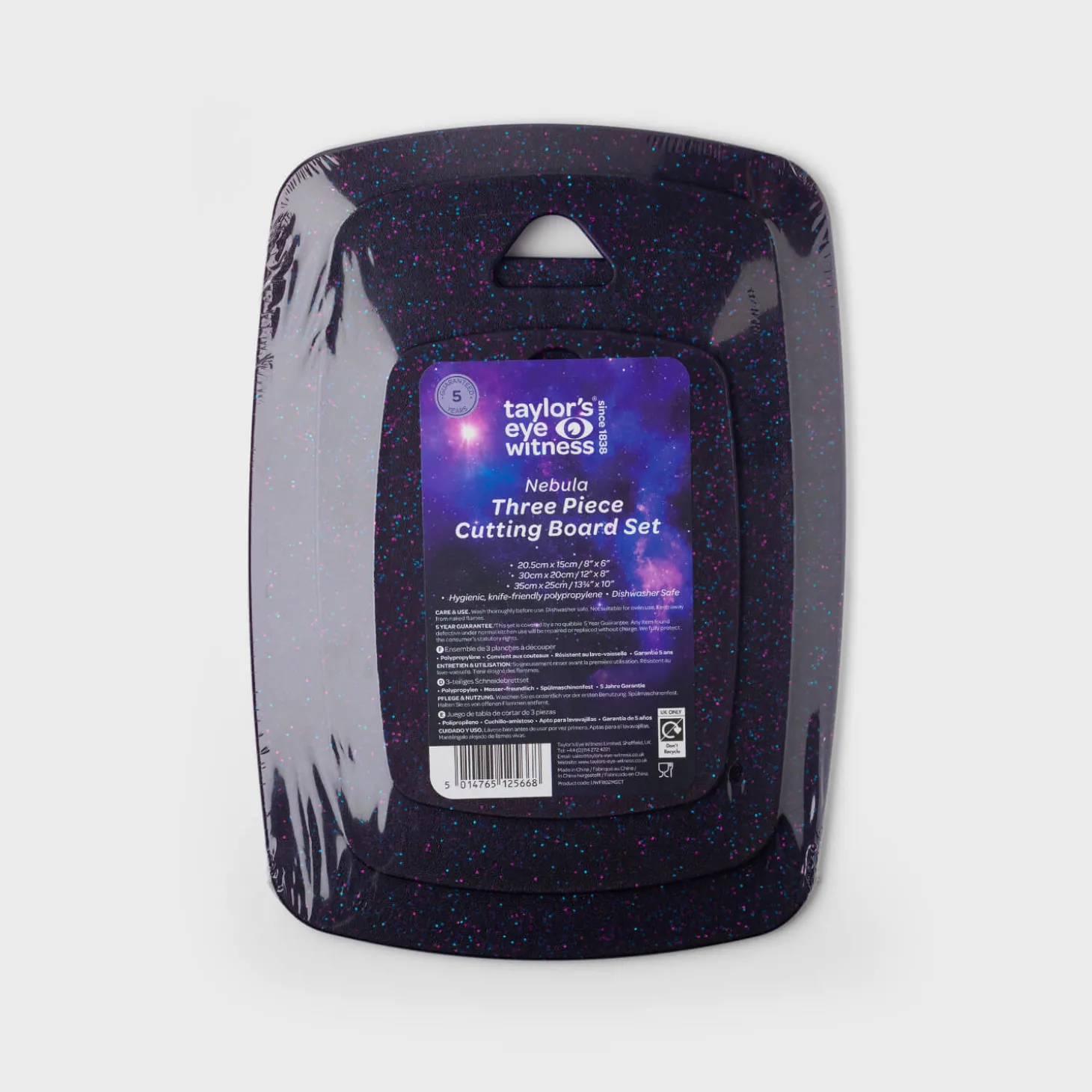 Taylor’s Eye Witness presents the 3-Piece Cutting Board Set which forms part of their Nebula range. Odour and stain resistant, these chopping boards are perfect for many kitchen tasks, hygienic and knife-friendly, and ideal for all types of food preparation. These delightful boards complement all the utensils in the Nebula range.