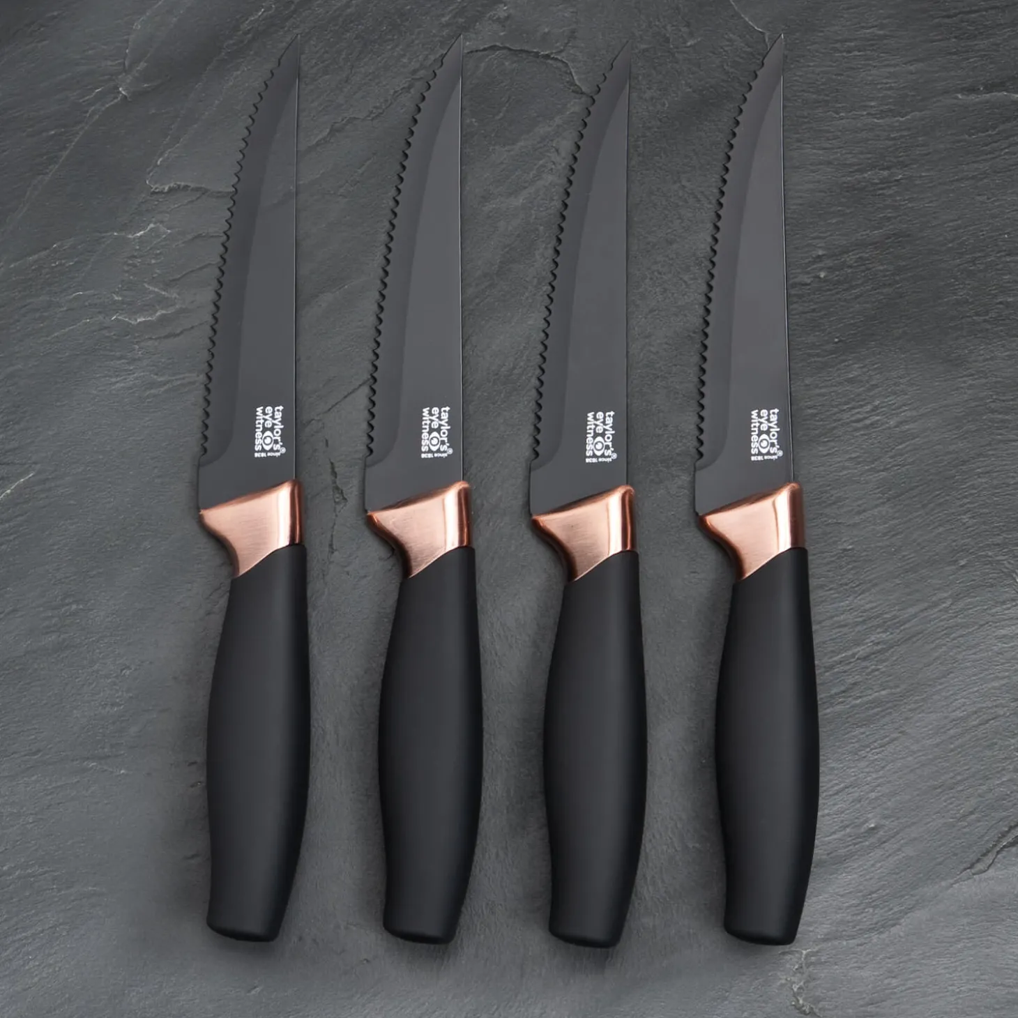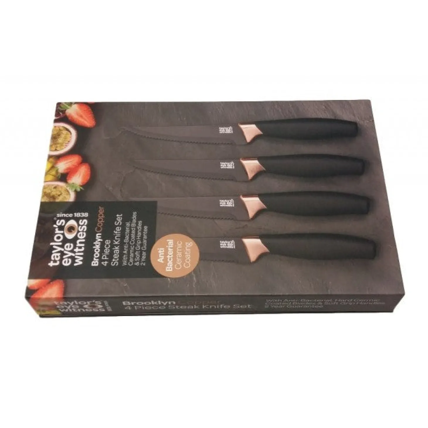 Taylor’s Eye Witness presents the Brooklyn range which features this 4-piece steak knife set. With blades forged from hollow ground steel, you can expect exceptional cutting performance. Each knife has a special anti-bacterial coating and an ergonomic rubber handle for optimum comfort and control. Includes a 2-year guarantee.