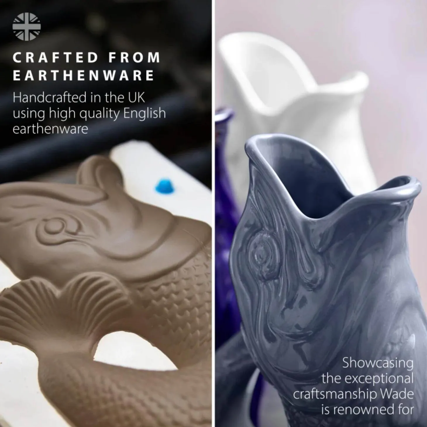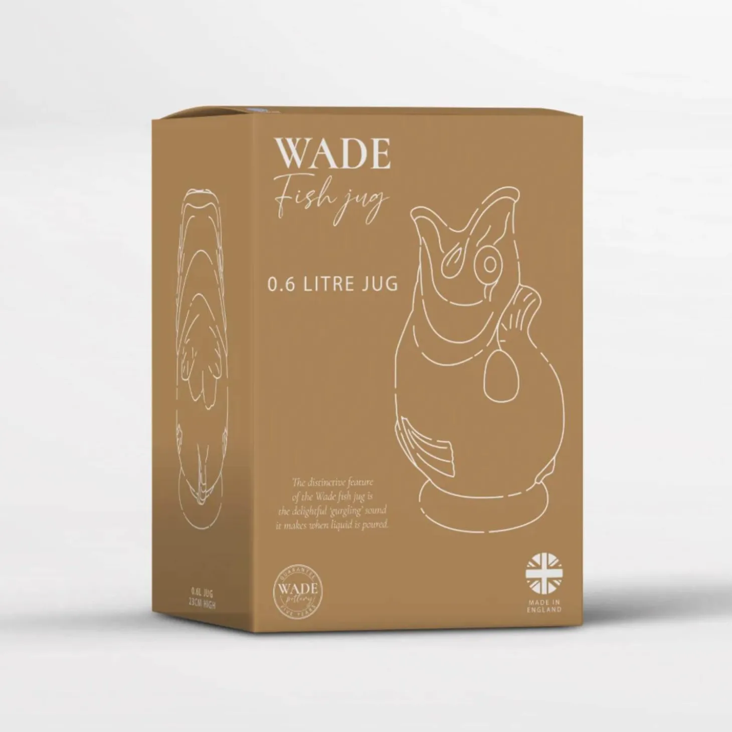 Wade presents the 600ml Fish Gluggle Jug in French Grey, handcrafted in their potteries in Stoke-on-Trent, where they have been creating beautiful earthenware for over 150 years. This iconic shape has been a fixture in homes since the mid-1800s. Wade uses a traditional slip casting method; the jugs are formed using a plaster mold and, once dried, are fired in their kilns. Each jug is then hand-dipped into a coloured glaze before being placed back into the kiln to achieve the final finish.