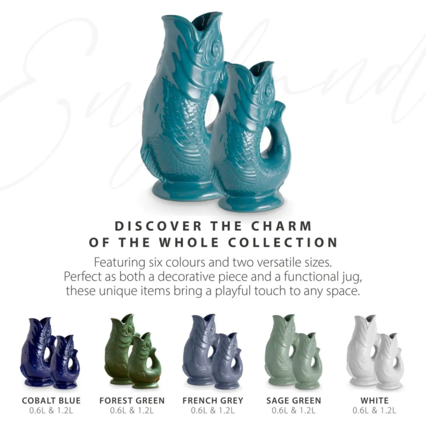 Wade presents the 1.2 Litre Fish Gluggle Jug in Agave, handcrafted in their potteries in Stoke-on-Trent, where they have been creating beautiful earthenware for over 150 years. This iconic shape has been a fixture in homes since the mid-1800s. Wade uses a traditional slip casting method; the jugs are formed using a plaster mold and, once dried, are fired in their kilns. Each jug is then hand-dipped into a coloured glaze before being placed back into the kiln to achieve the final finish.