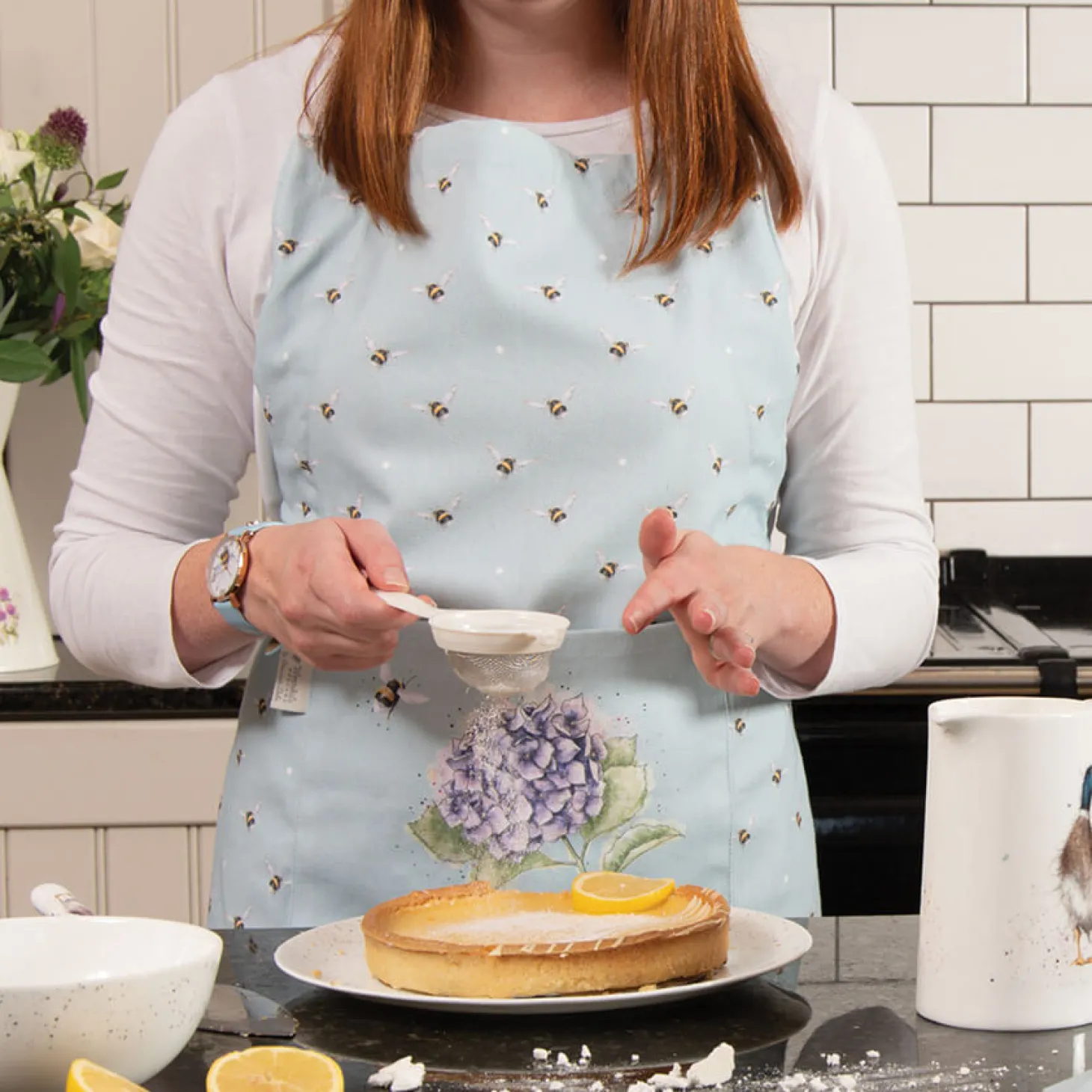 Wrendale Designs presents the ‘Busy Bee’ Apron, beautifully illustrated by renowned artist Hannah Dale. This lovely blue apron is decorated with lots of bees and a hydrangea flower on the large handy front pocket with contrasting coloured neck loop and straps that are fully adjustable. A great gift for the cook or baker in your life or a treat for yourself.