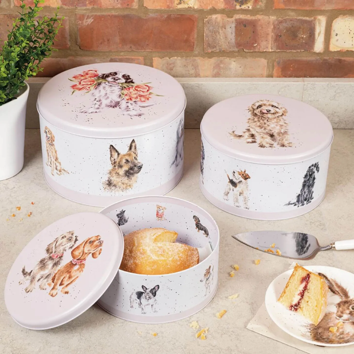 Wrendale Designs presents their three-tier Dogs Cake Tin Nest beautifully illustrated by the renowned artist Hannah Dale. These lovely tins feature wonderful illustrations of different dogs and for even more delight, each tin features more illustrations by Hannah Dale on the inside too, the tins have a light creamy pink lid and bands around the base. A perfect way to store all your cakes, buns and much more. This Wrendale Cake Tin Nest would make a lovely gift or a treat for yourself.Â
