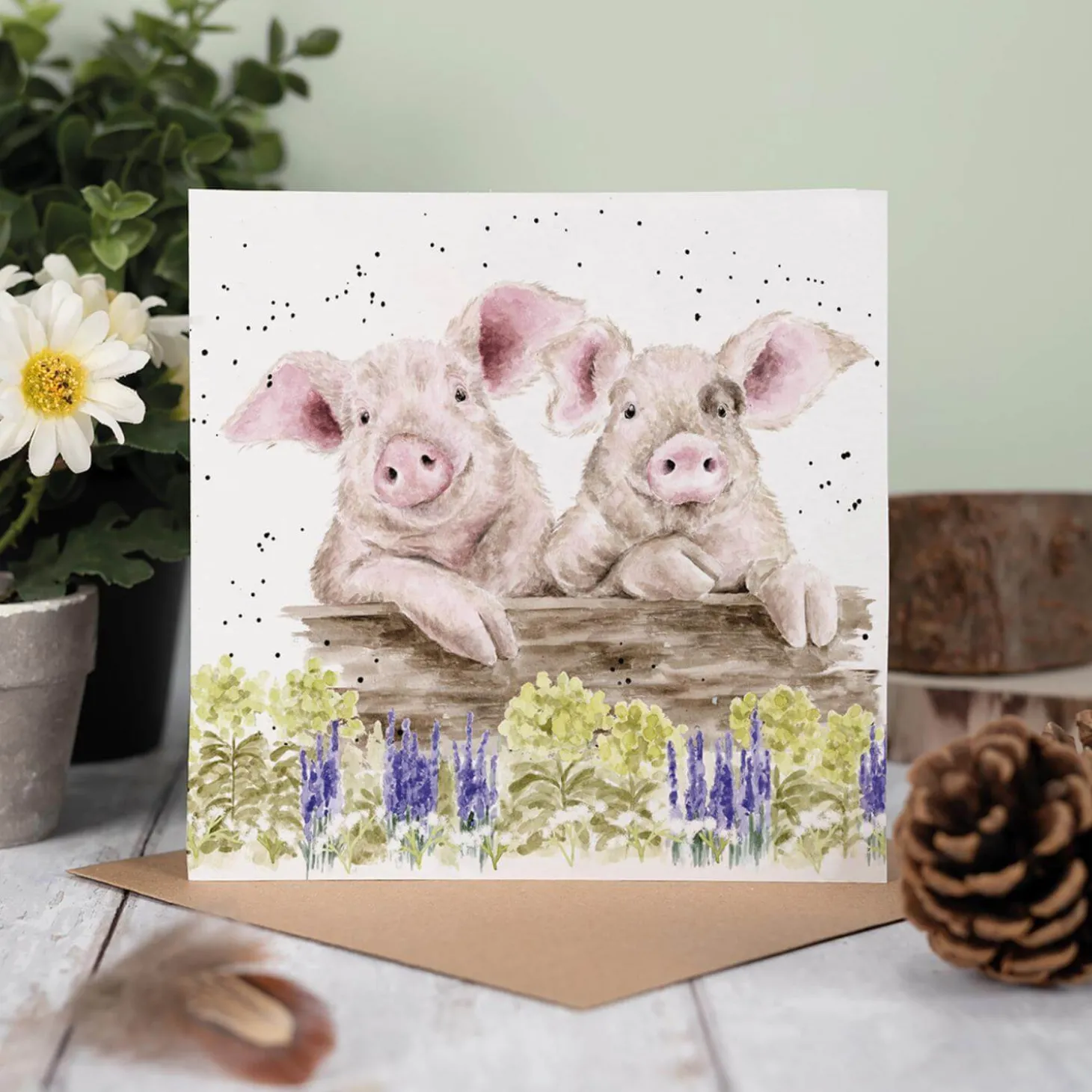 Wrendale Designs presents the ‘Nosy Neigh-Boars’ card, featuring illustrations by renowned artist Hannah Dale. This charming card showcases two delightful pigs looking over a wall by some flowers. The blank interior invites you to unleash your creativity; personalise it with a heartfelt message that is sure to warm the recipient’s heart.