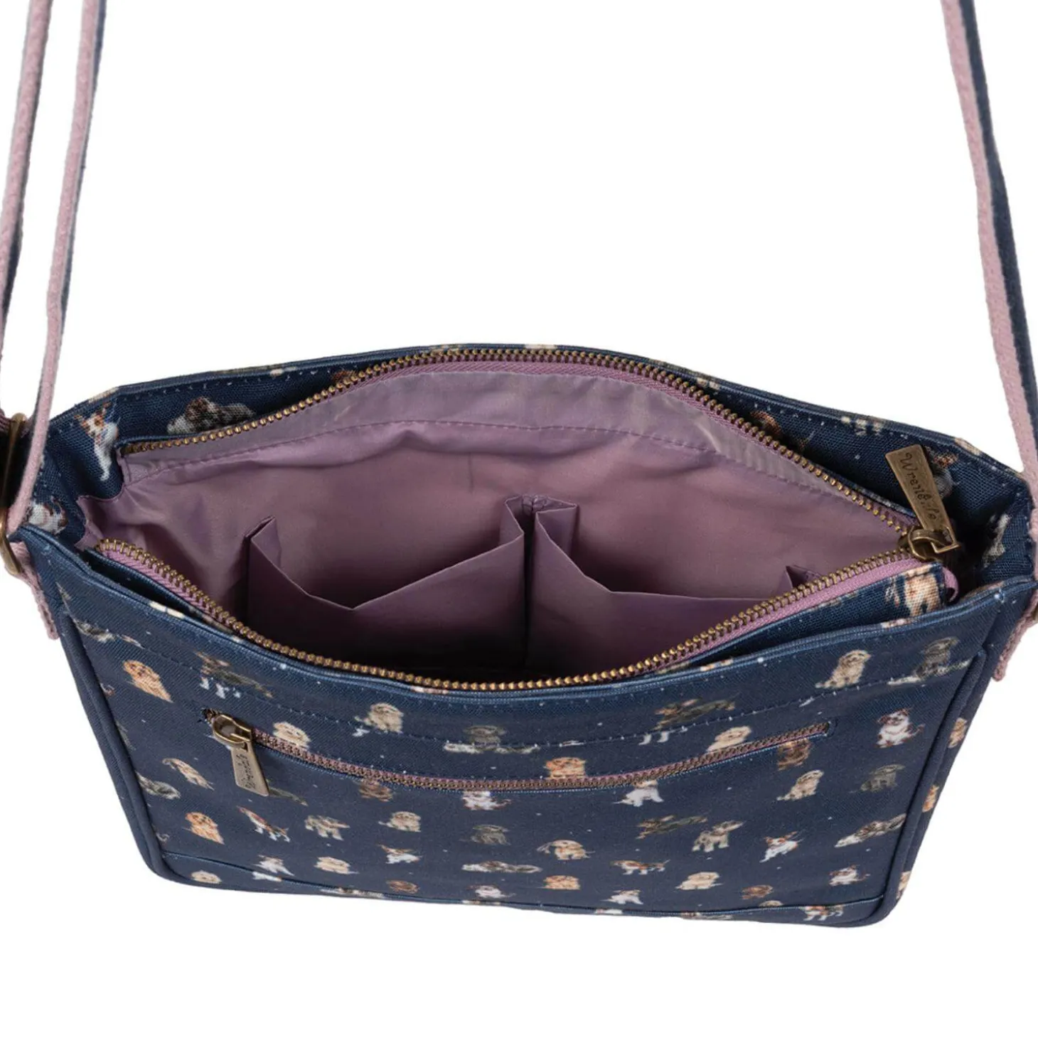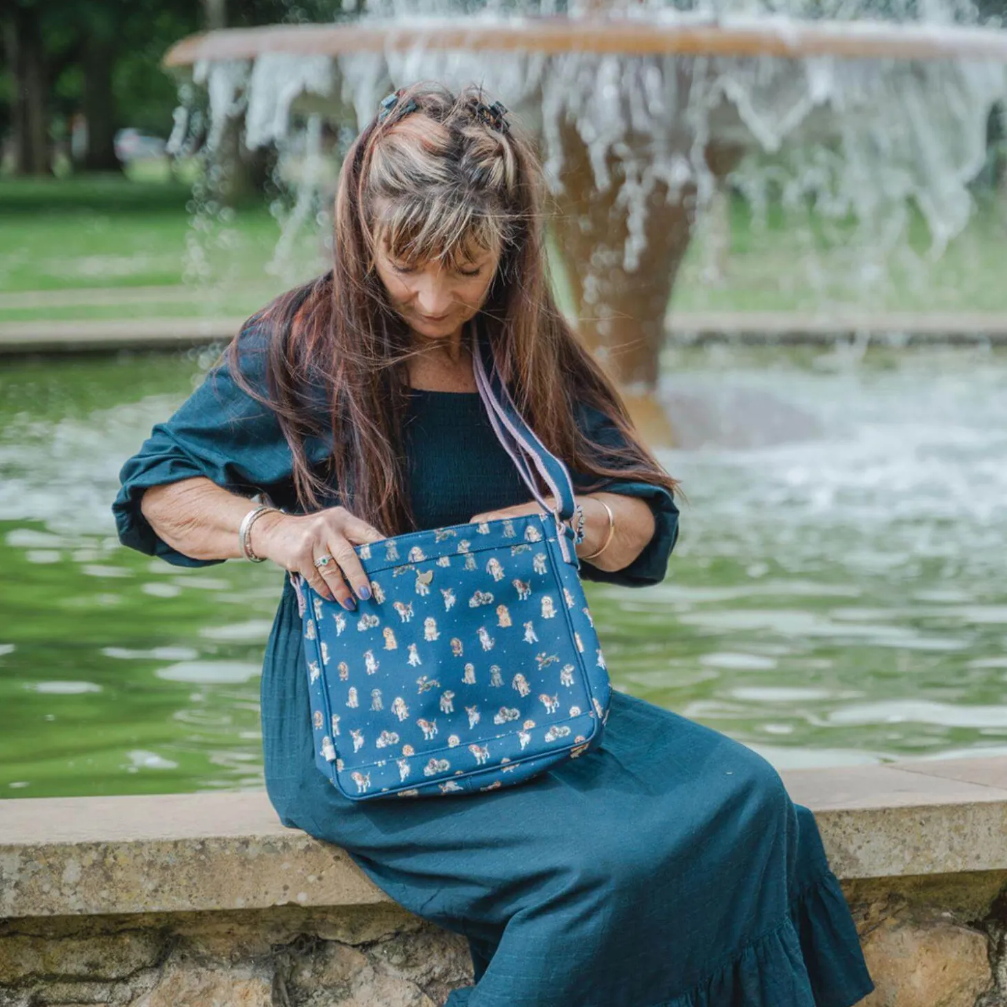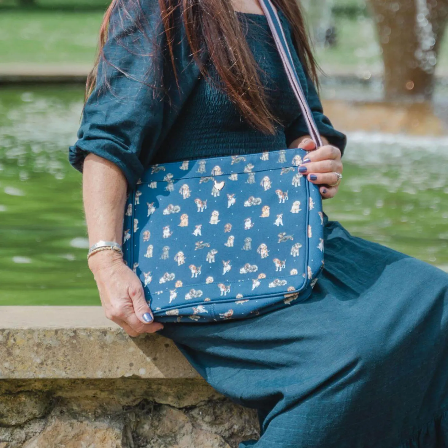 Wrendale Designs presents the ‘A Dogs Life’ Everyday Bag featuring illustrations by renowned artist Hannah Dale. This gorgeous bag is ideal for a shopping trip, going out for lunch or for going on your travels. Beautifully illustrated with a variety of dogs on a navy blue background, a lovely wide adjustable shoulder strap, a top and side zip plus inside pockets to hold all that you need. Other matching items are available subject to availability.Â