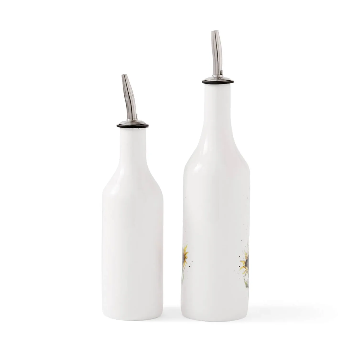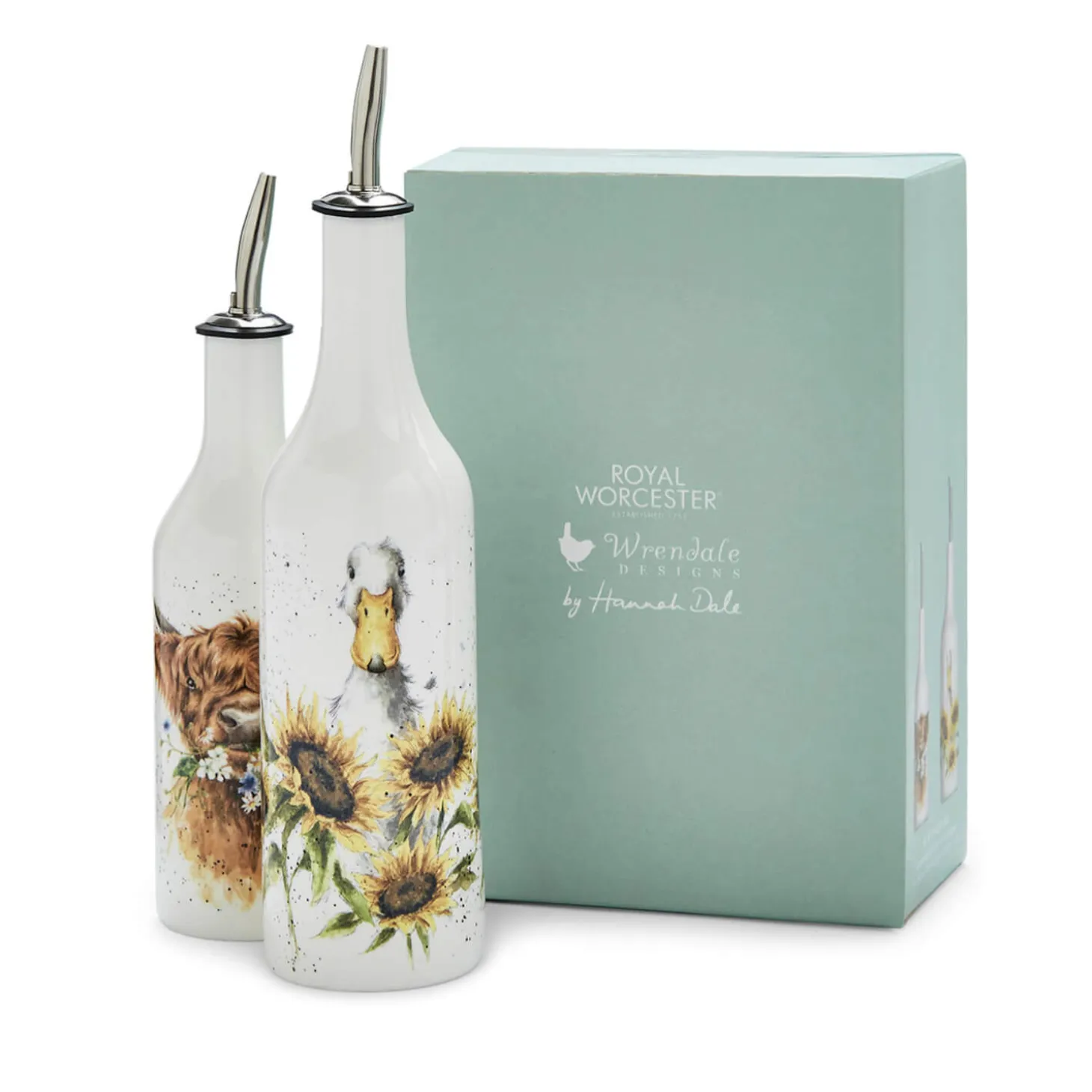 Wrendale Designs presents the Oil & Vinegar Set, produced by Royal Worcester with beautiful illustrations by renowned artist Hannah Dale. These delightful pourers feature a highland cow with daisies on one and a duck with sunflowers on the other. Just perfect for decanting olive oil and balsamic vinegar for use in your kitchen or as serveware on your dining table.