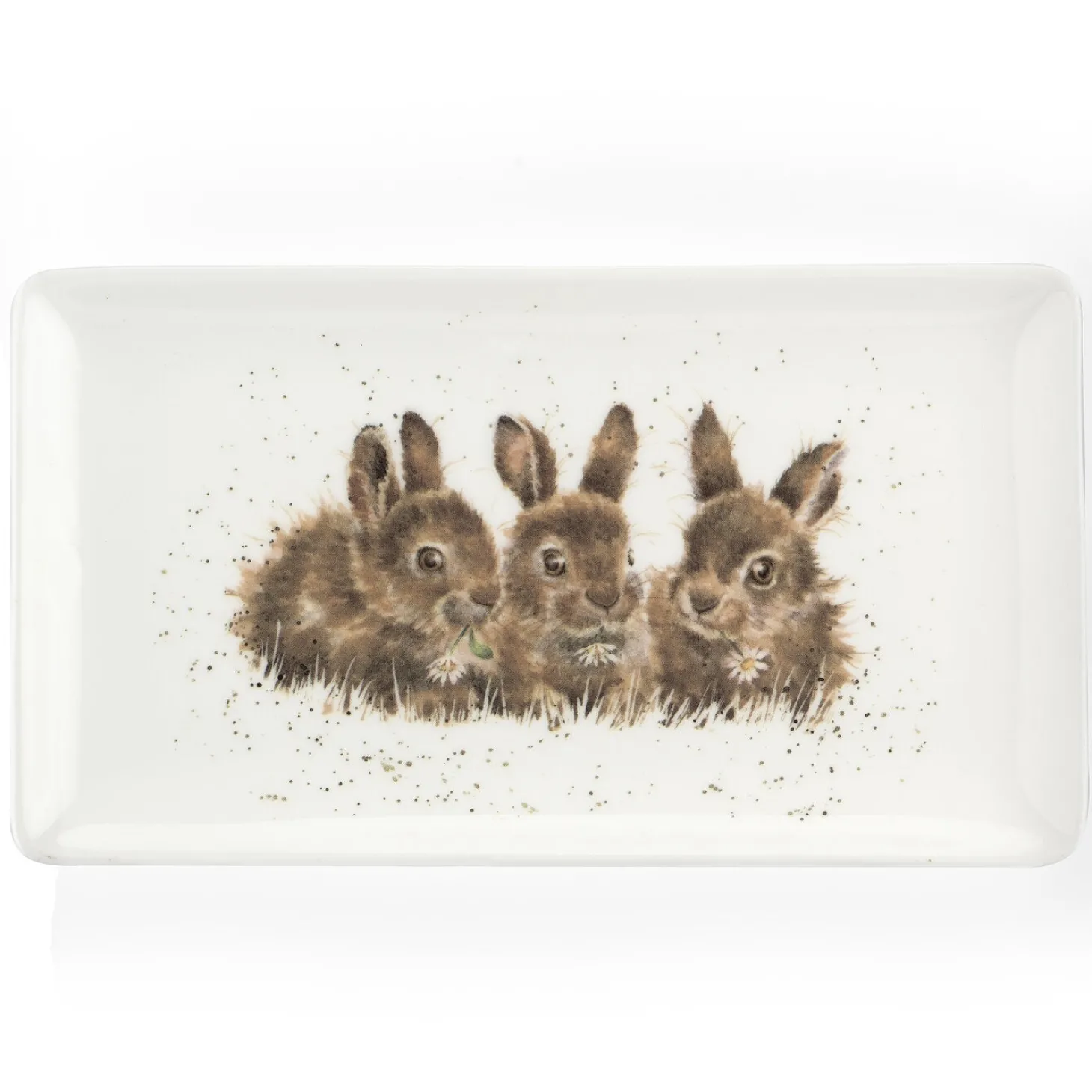 The Wrendale Rectangular Serving Tray is part of a beautiful range produced by Royal Worcester which features illustrations of animals by Hannah Dale for Wrendale Designs. The Fine Porcelain tray features an image of three small rabbits huddled together eating wildflowers. The design complements other designs within the range, allowing you to mix and match to build your perfect collection.Â