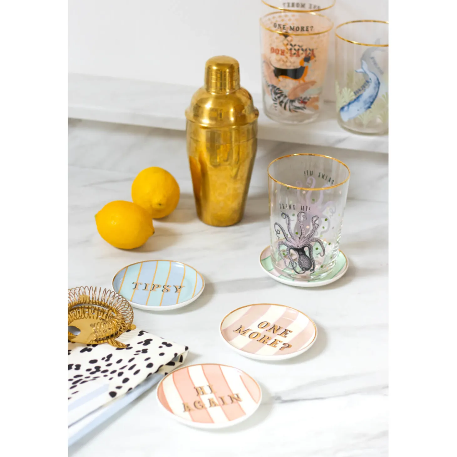 Yvonne Ellen presents the Fine China 4-Piece Coaster Set in Slogan design. Yvonne Ellen, a British designer, brings a touch of elegance and charm to her products each telling a whimsical tale using animal characters and playful slogans. Beautifully made and designed to make you smile, these coasters are sure to add a touch of fun and sophistication while protecting your table.