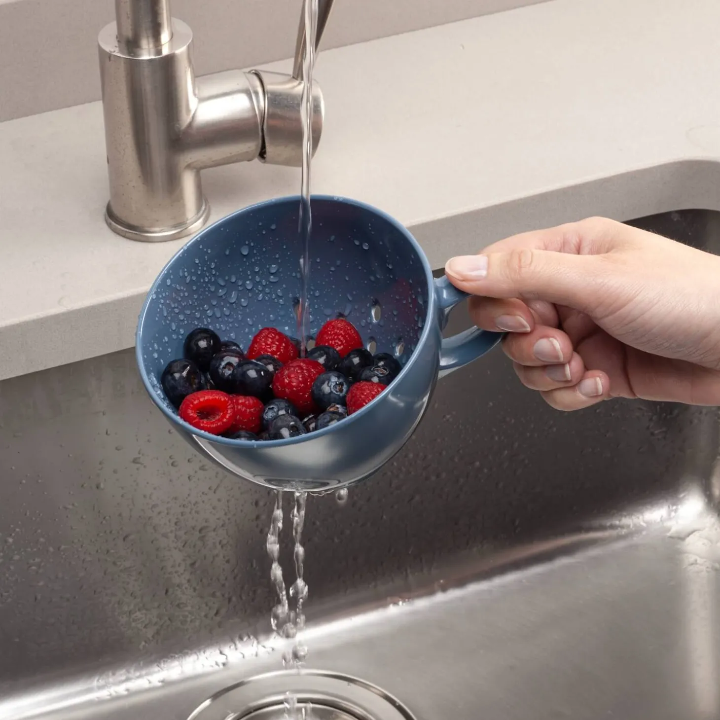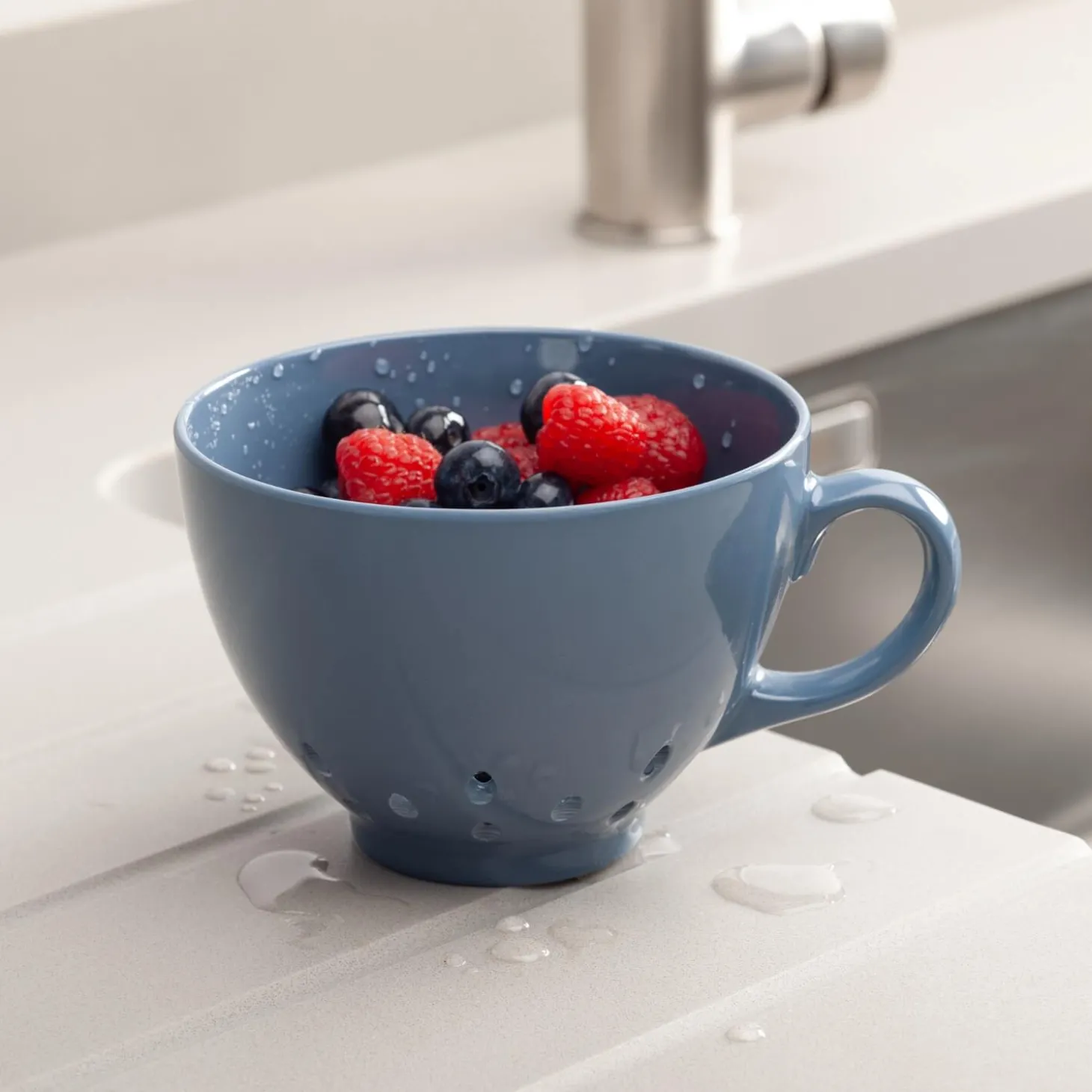 Zeal presents the Berry Colander in Provence Blue, this delightful little colander is about the size of a large teacup with a handle on the side, ideal for draining or rinsing small amounts, like fruit, peas and more. Small, but strong and sturdy, this Berry colander will sit securely in your sink or on your countertop.