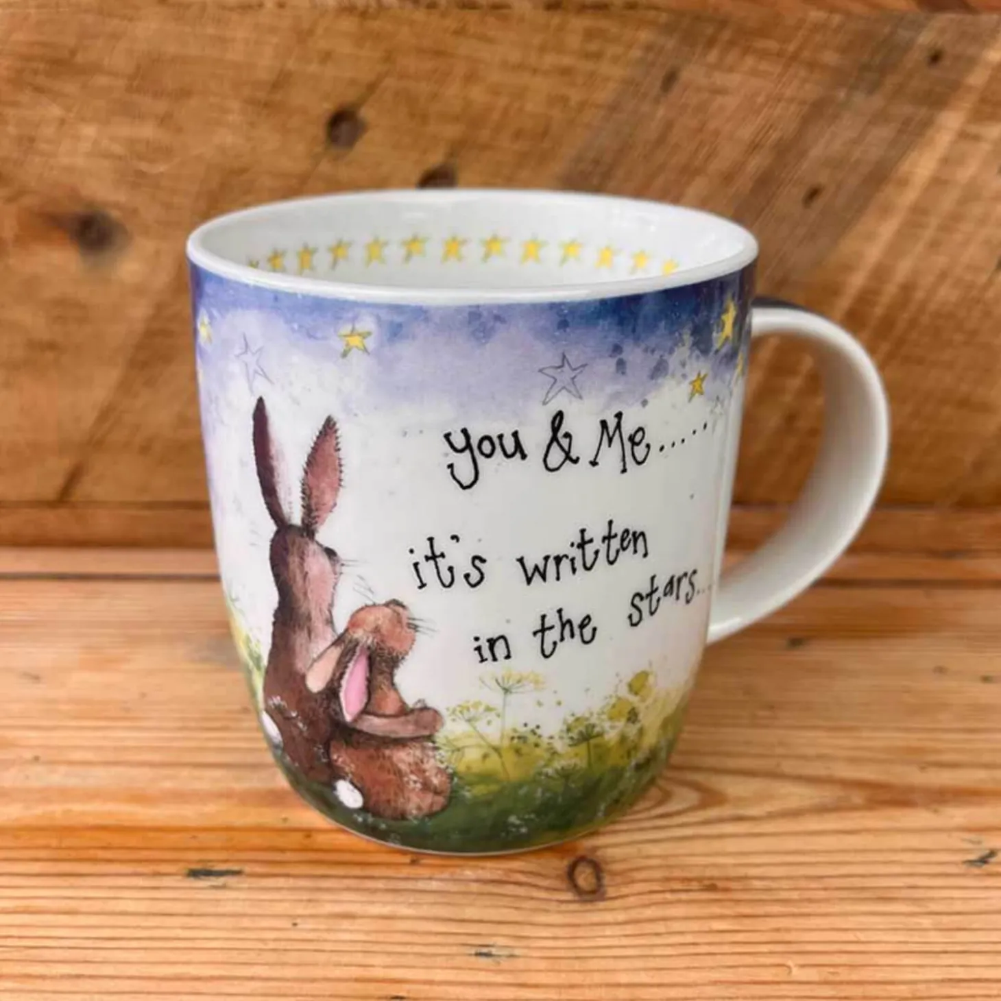 Alex Clark presents the ‘Written In The Stars’ mug, this fabulous mug features an illustration showing two delightful rabbits looking up at the stars with the wording ‘You and Me……. it’s written in the stars’. Further illustrations feature around the inner rim and down the handle. A lovely way to start your day with a tea or coffee in this great mug!