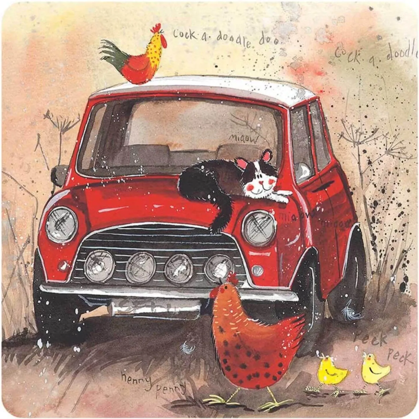 This lovely Mini coaster from Alex Clark features a cat and various chickens on and around a bright red mini. The illustration by Alex Clark complements other products in the range. The perfect coaster to go with your mug of coffee or tea.